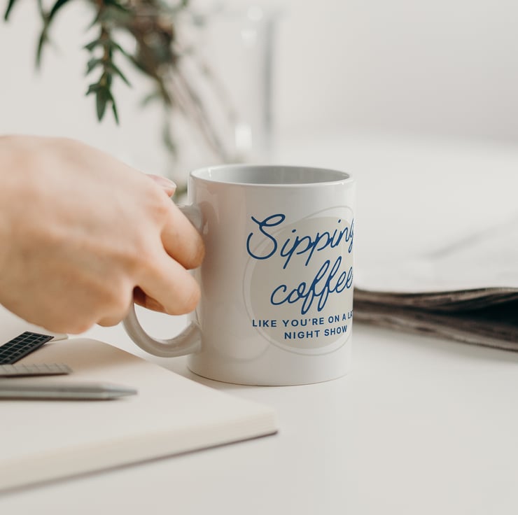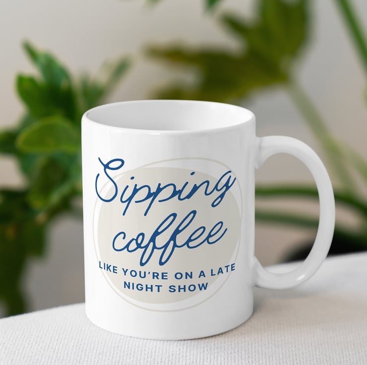 Elevate your coffee routine with our charming ceramic mug! It showcases the message "Sipping Coffee Like You're on a Late Night Show". The perfect lyric inspired gift.