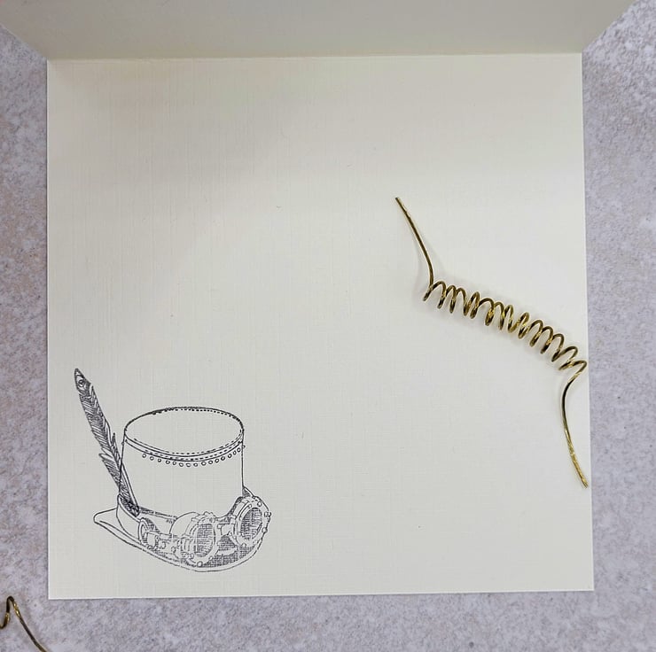 The card is made from quality ivory linen textured cardstock and is tent fold, it has a focal panel with the design on top. The inside is blank, save for a stamped image of a steampunk hat and goggles. Some of the images are heat embossed for light texture and shine. Made using quality archival inks which are non-toxic and acid free. Rich colours of midnight blue, black, charcoal and honey and small touches of gold. Finished with splashes and black and white fineliners.