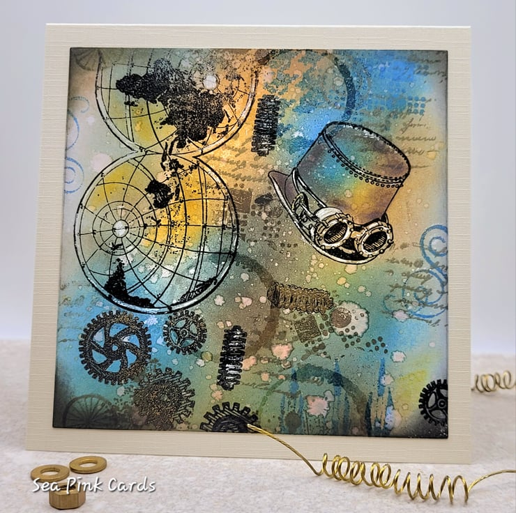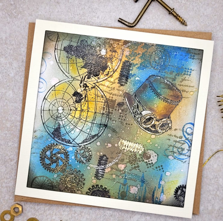 A 12.5 x 12.5 cm handmade blank textured card with a great detailed, steampunk, vintage vibe. A card for all occasions and with handstamped steampunk images and hand-inked background. This would be suitable for father's day, a birthday, thank you or as a note card.