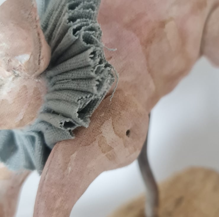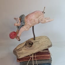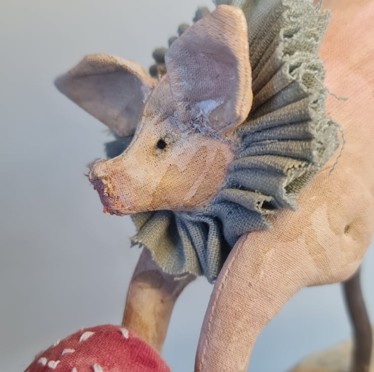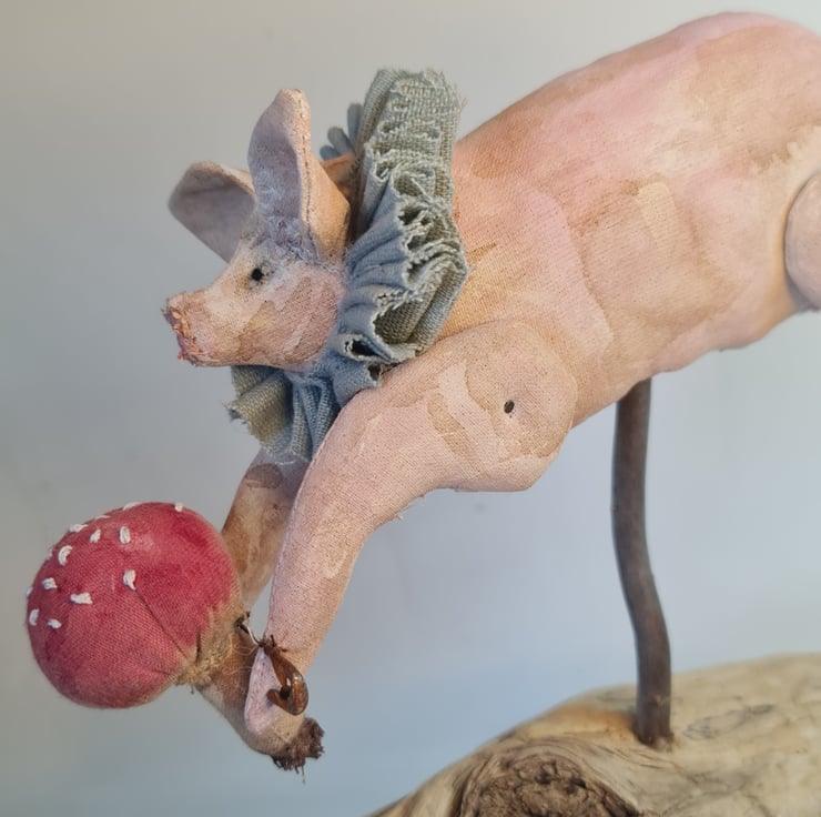 This OOAK soft sculpture leaping piggy is hand and machine stitiched in unbleached cotton. Hand painted and stained to look aged and worn. Piggy wears a powder blue cotton ruffle around its neck. His jute piggy tail is secured with a rusty pin. He carries his foraged toadstool with another rusty pin. Piggy sits on foraged wood dried over time.