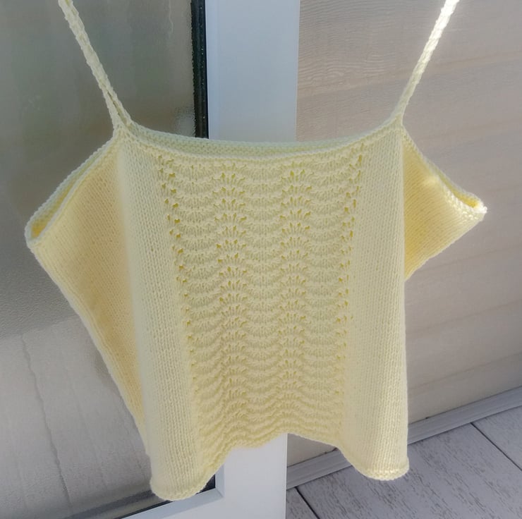 This hand knit PATTERN is for a ladies vest or camisole, with three variations. To fit chest size: 81 (86: 91: 97: 102: 107) cm or 32 (34: 36: 38: 40: 42) inch The camisole is knitted in double knitting yarn and 3.75 mm and 4 mm knitting needles and is knit flat and seamed.