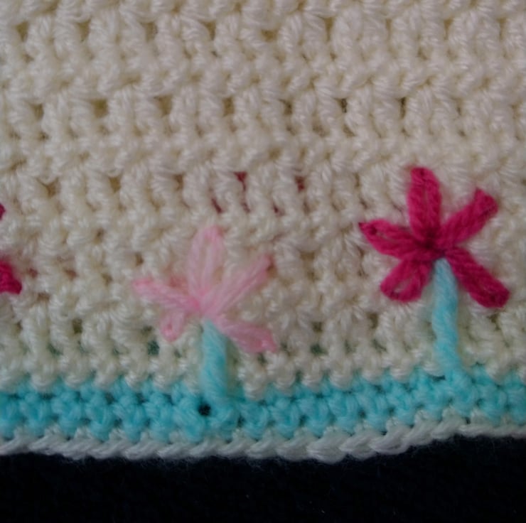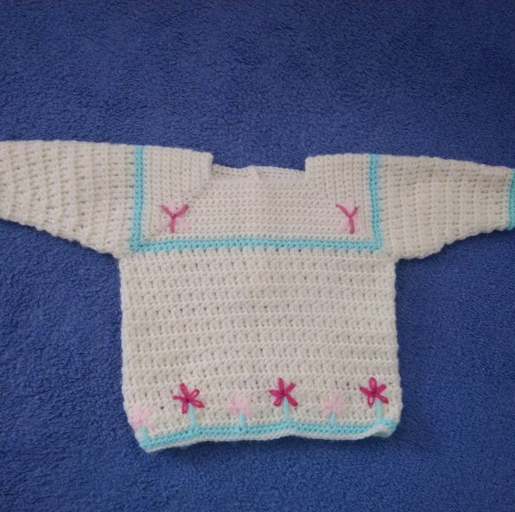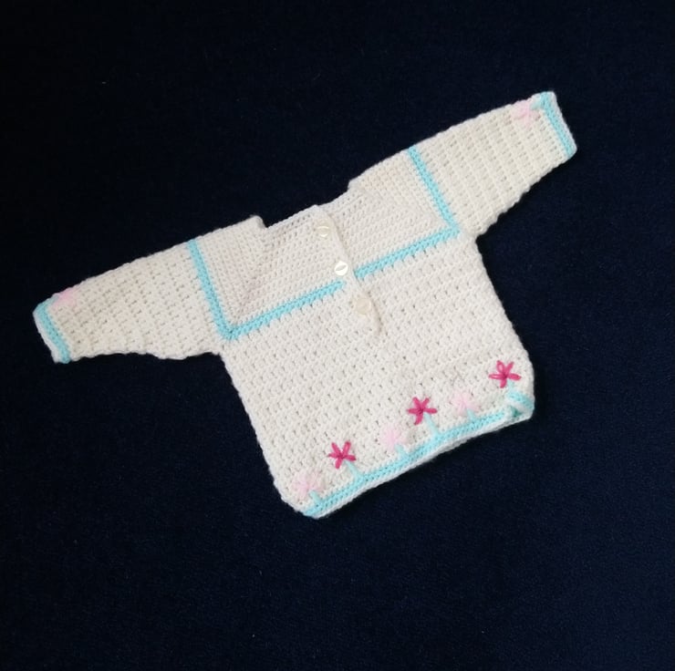 Crochet Baby jumper in a lovely warm soft cream double knitting acrylic yarn. Peppermint green edging and embroidered flowers in shades of pink. Fastens at the back with 3 buttons.