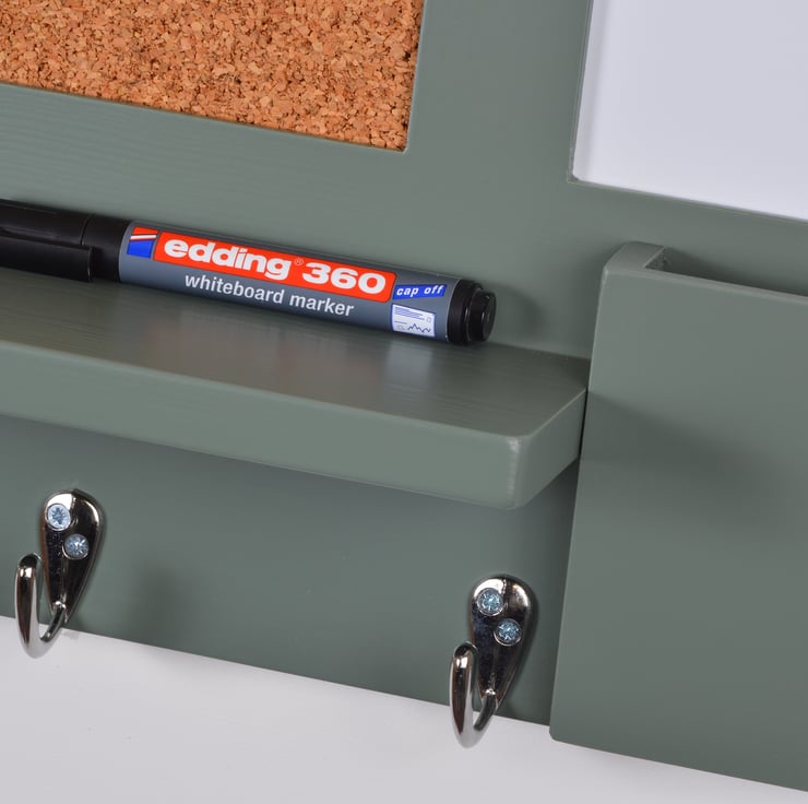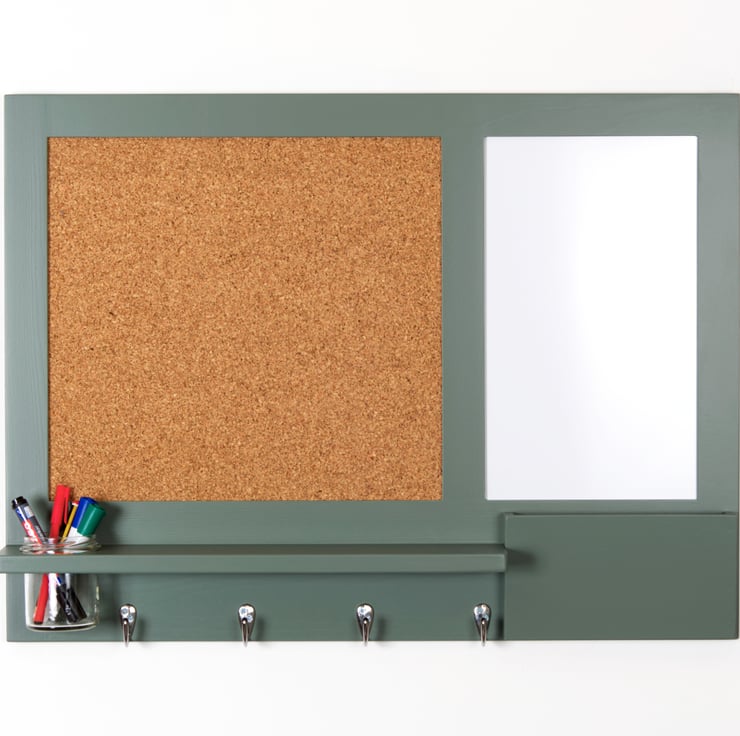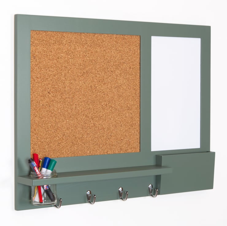 Introducing a stunning organiser featuring both a whiteboard and cork board, elegantly finished in a low-sheen paint matched to Farrow & Ball's Green Smoke hue.