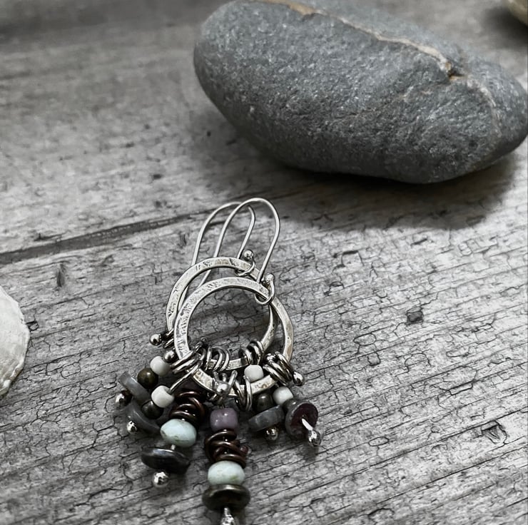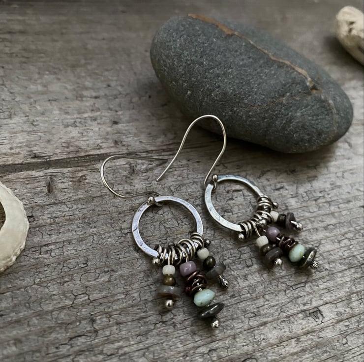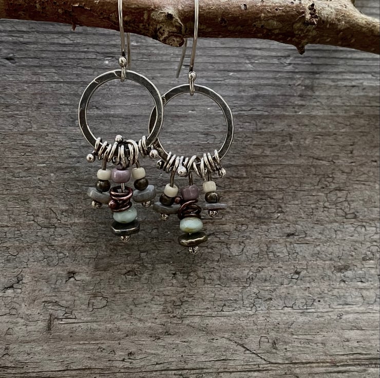 Made from recycled sterling silver, these boho dangly hoops are subtly hammered for a rustic texture. 3 beaded drops hang from each earring and include tiny glass and shell beads of dusky green and lilac hues, with copper accents.
