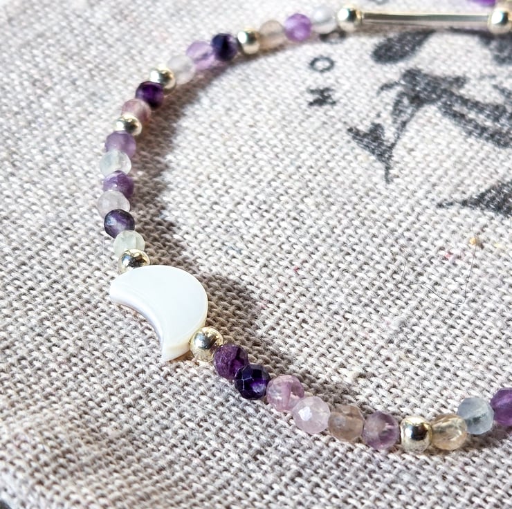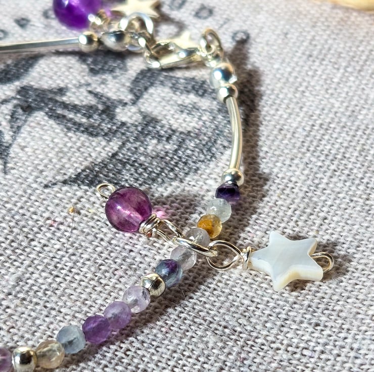 I've used high quality hand-faceted Rainbow Fluorite gemstone beads (3mm), sterling silver components: including round accent beads and tubular beads, & Mother Of Pearl crescent Moon and star charms.