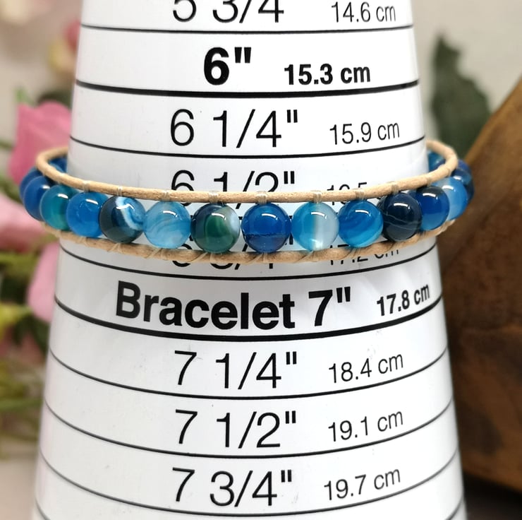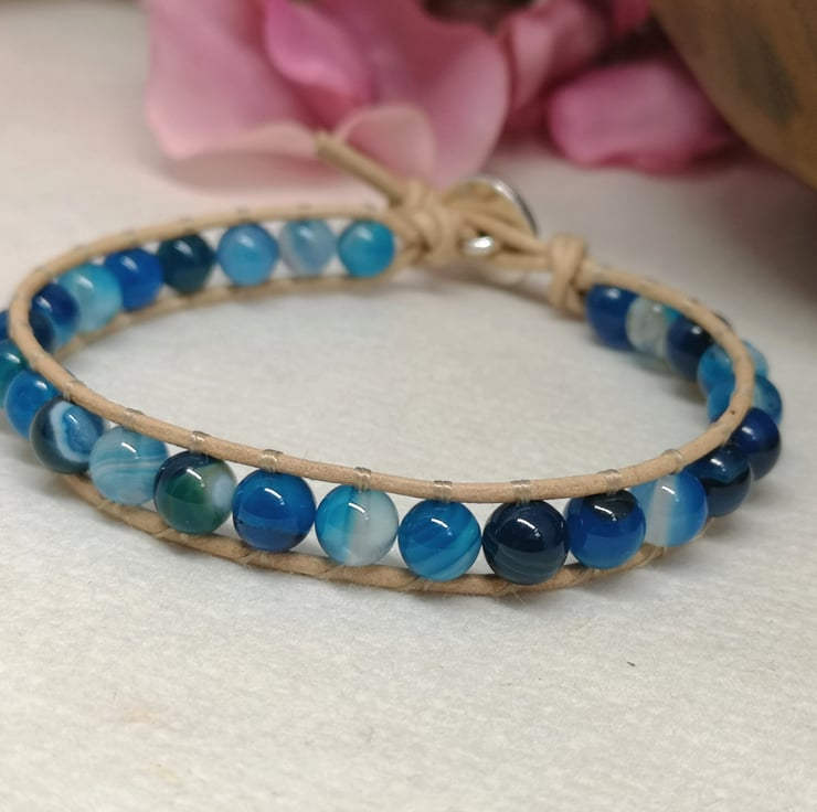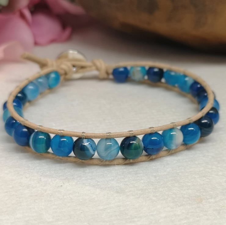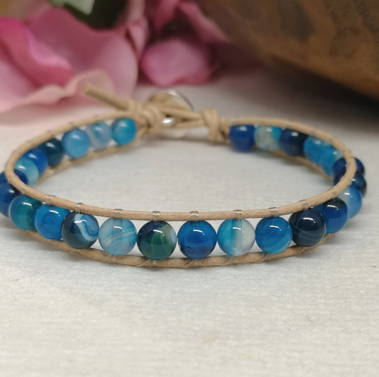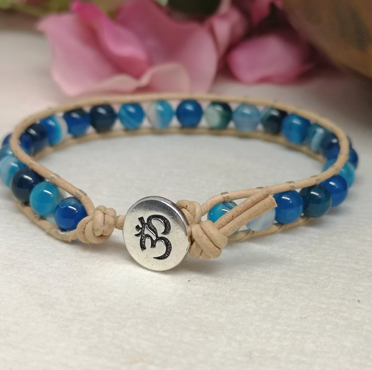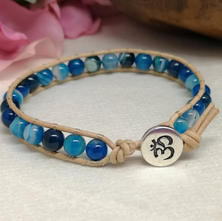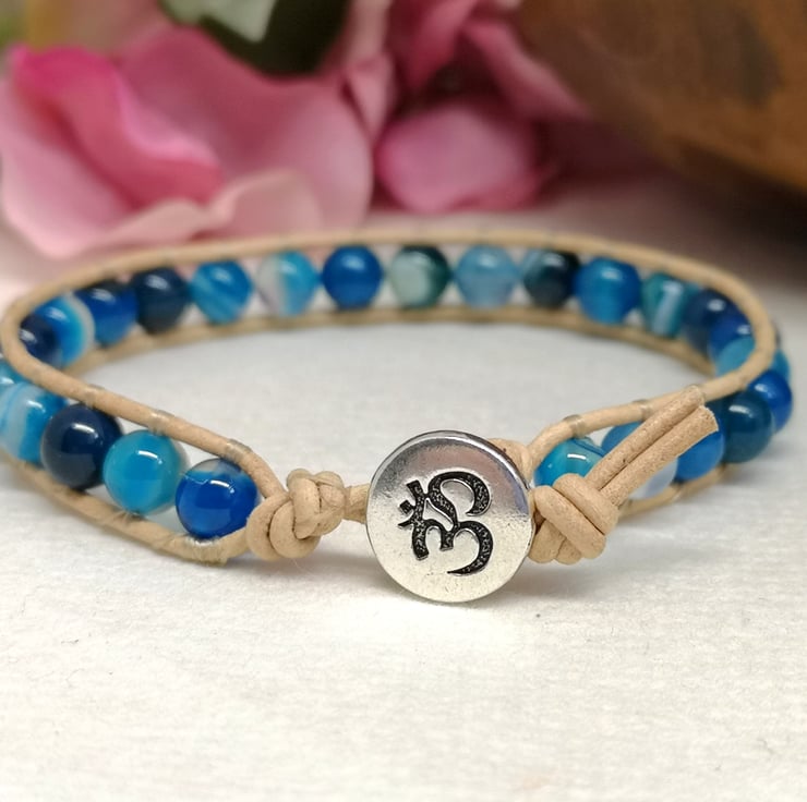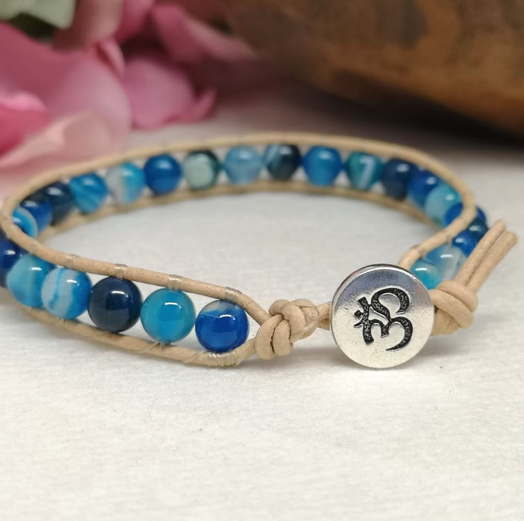 This bracelet features semi precious blue agate beads, with a pretty mix of shades and levels of transparency. They've been attached to pale tan leather cord and a button decorated with the Om symbol has been used as a fastener.