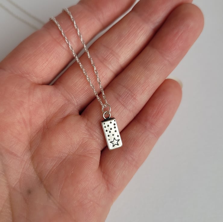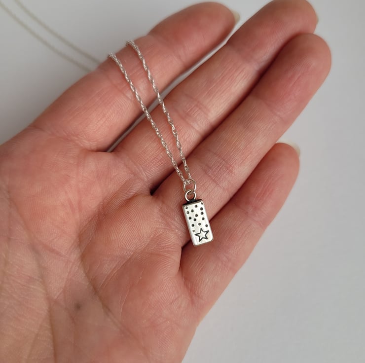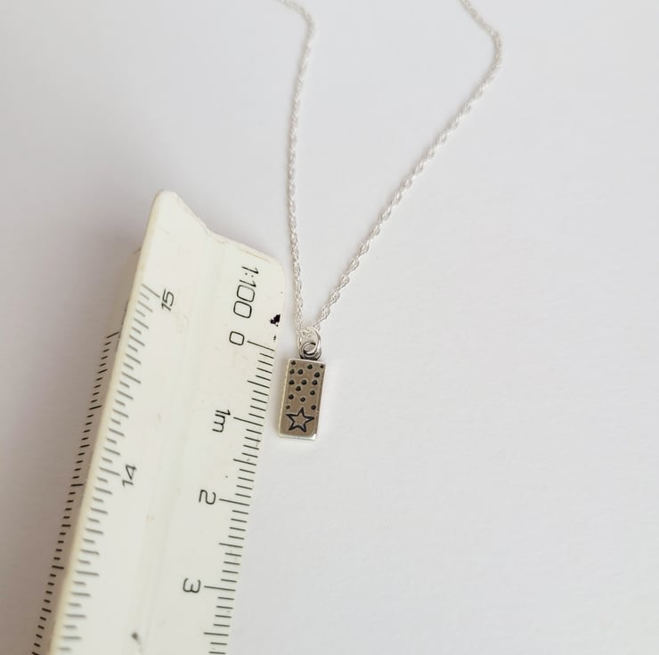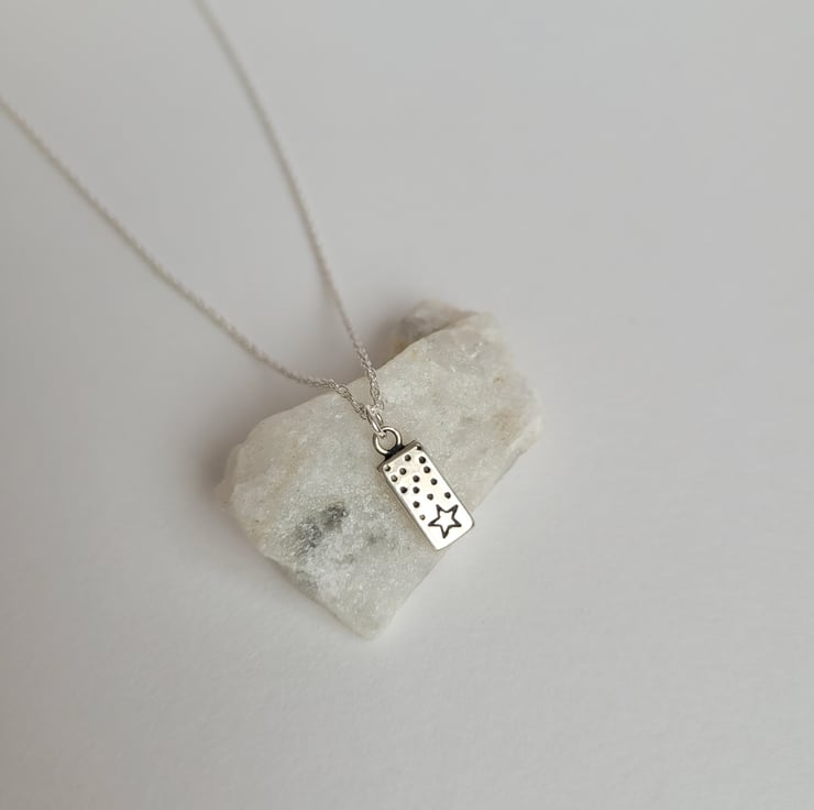 A small rectangle has been cut from solid sterling silver. On the front surface of the pendant a star has been hand stamped at the bottom and going from the top of the star to the top of the pendant small dots have been stamped to give the appearance of this being a shooting or falling star.