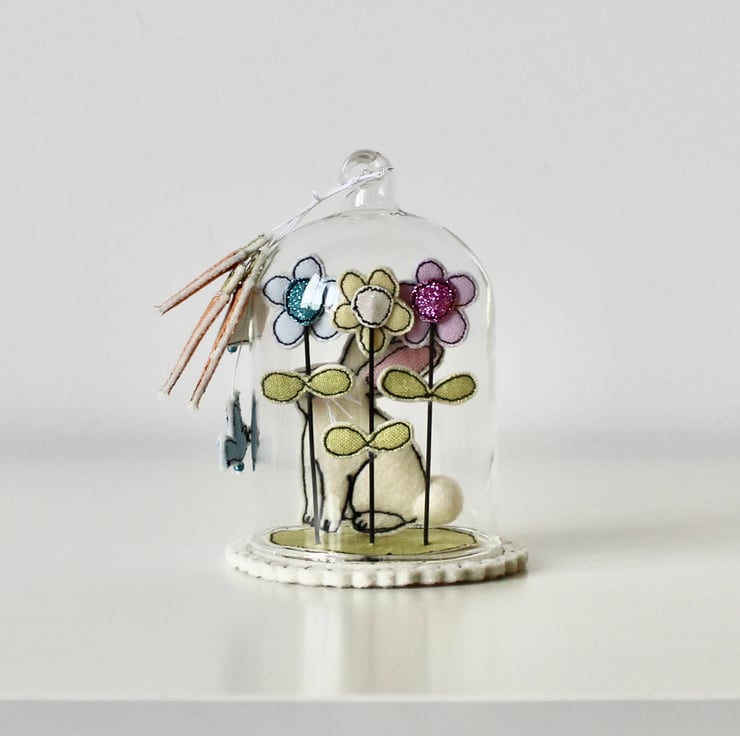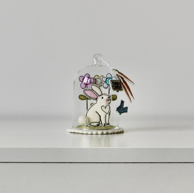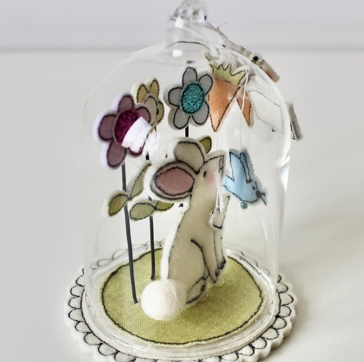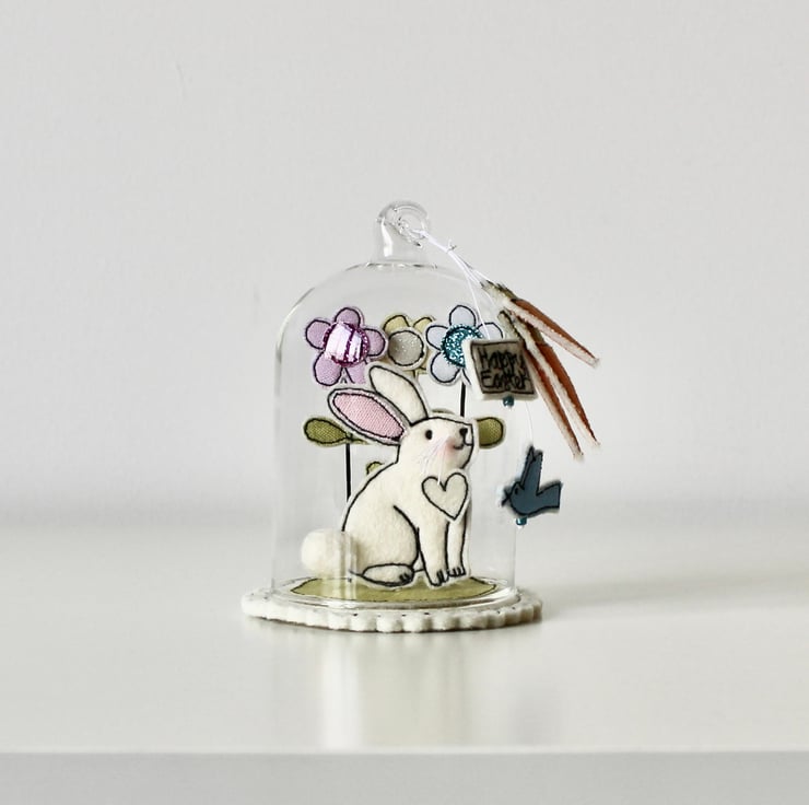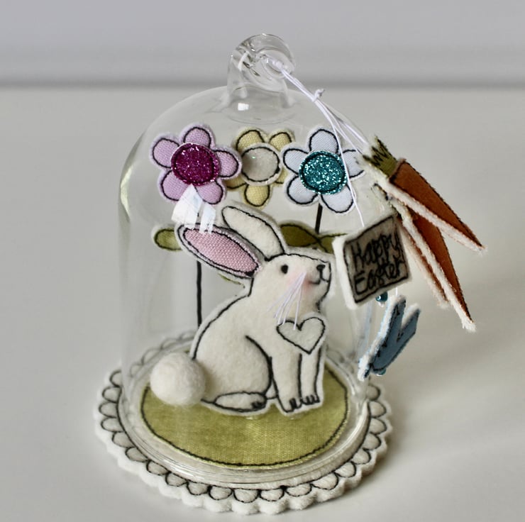 'Happy Easter Bunny' glass dome is created using free hand machine embroidery, cotton cloth, glitter cloth, wire and 100% wool felt. With linen thread and metallic blue glass beads.