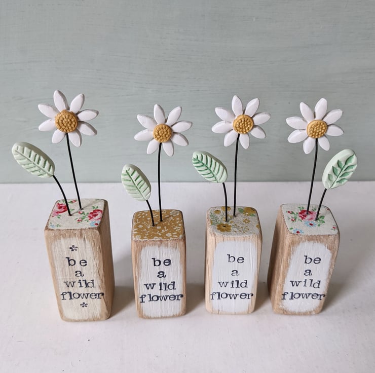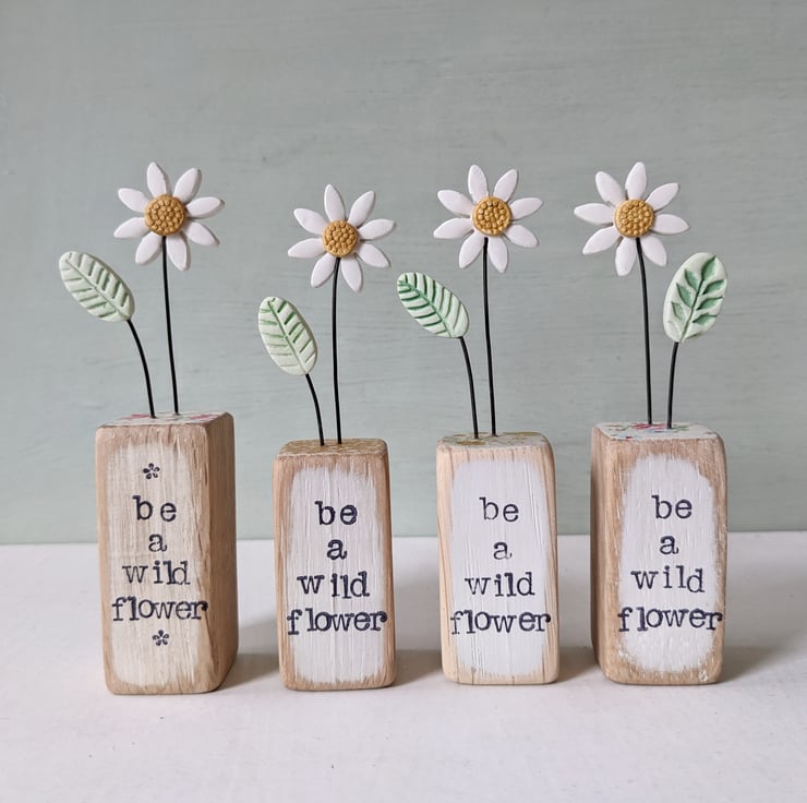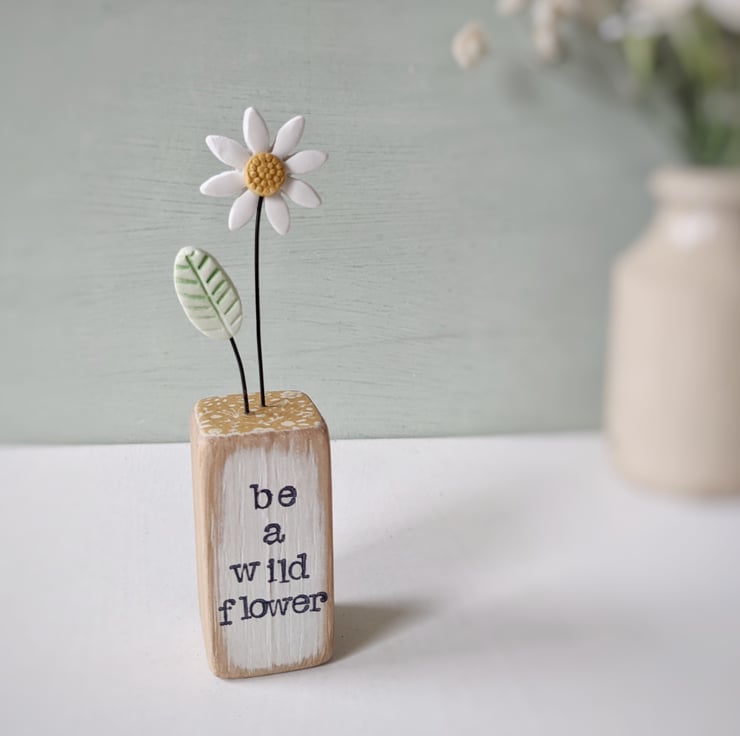 The front of the wooden block is hand stamped with the words 'be a wild flower'