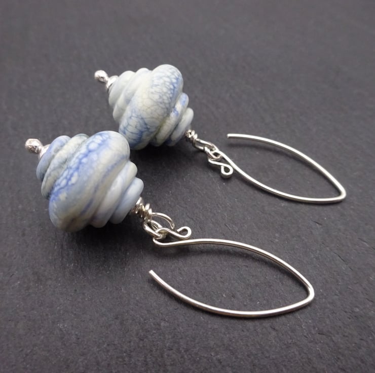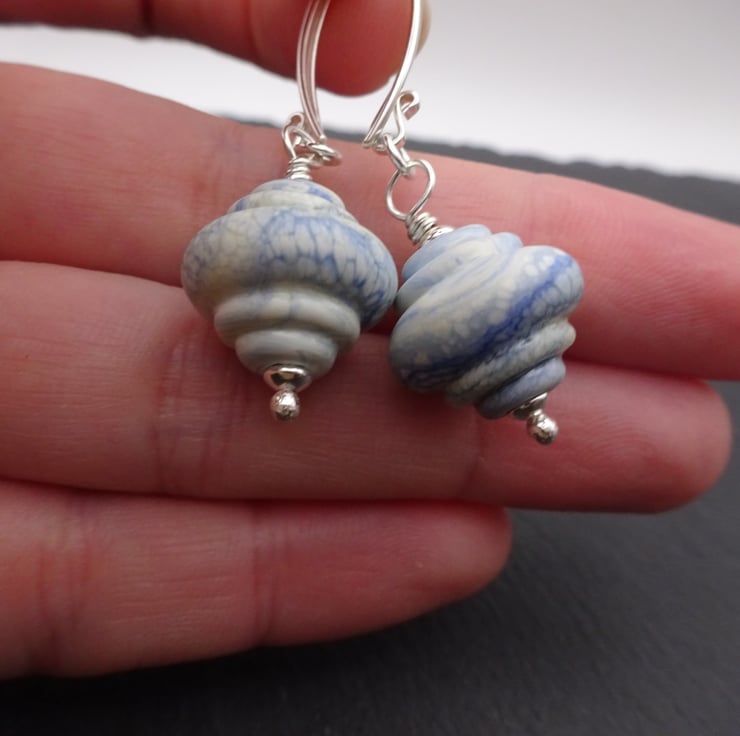 The lampwork glass beads have been handmade by me using blue glass and shaped with a roller, the beads have been tumbled to give a smooth finish.
