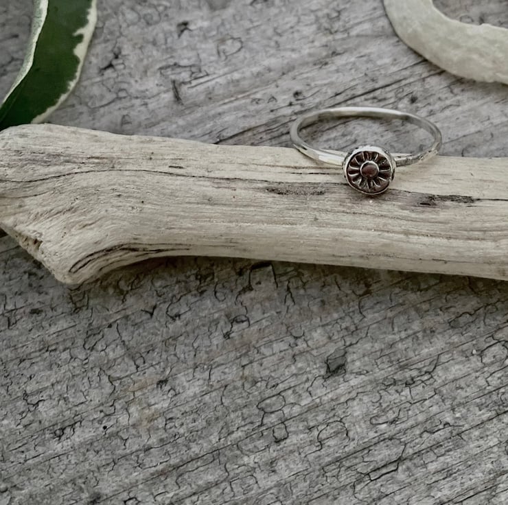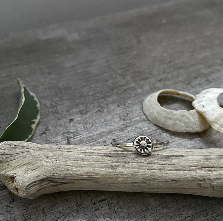 A little nugget of recycled sterling silver, gently hammered, and hand stamped with a rustic sunshine design. Sterling silver, smooth, polished band.