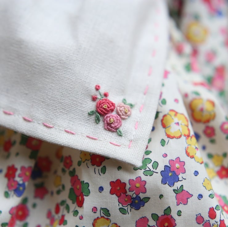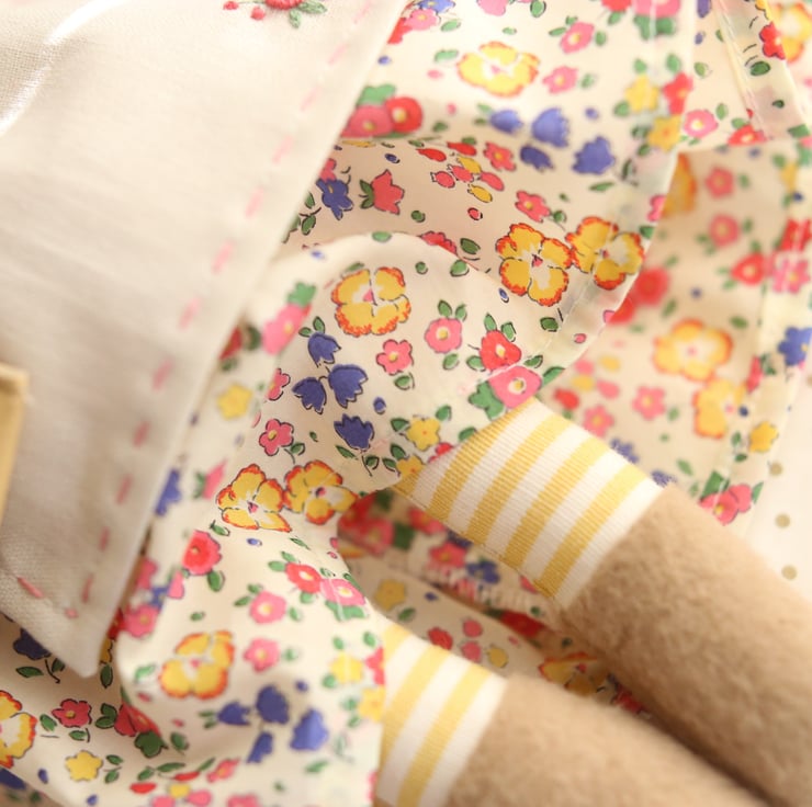 She is wearing a removeable dress made from beautiful Liberty of London fabric in Ella and Libby with a little Peter Pan collar.