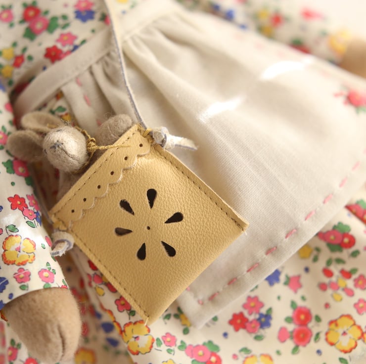 Her accessories include a tiny leather bag, hand punched with a daisy design and containing a baby bunny with a ric rac tie.
