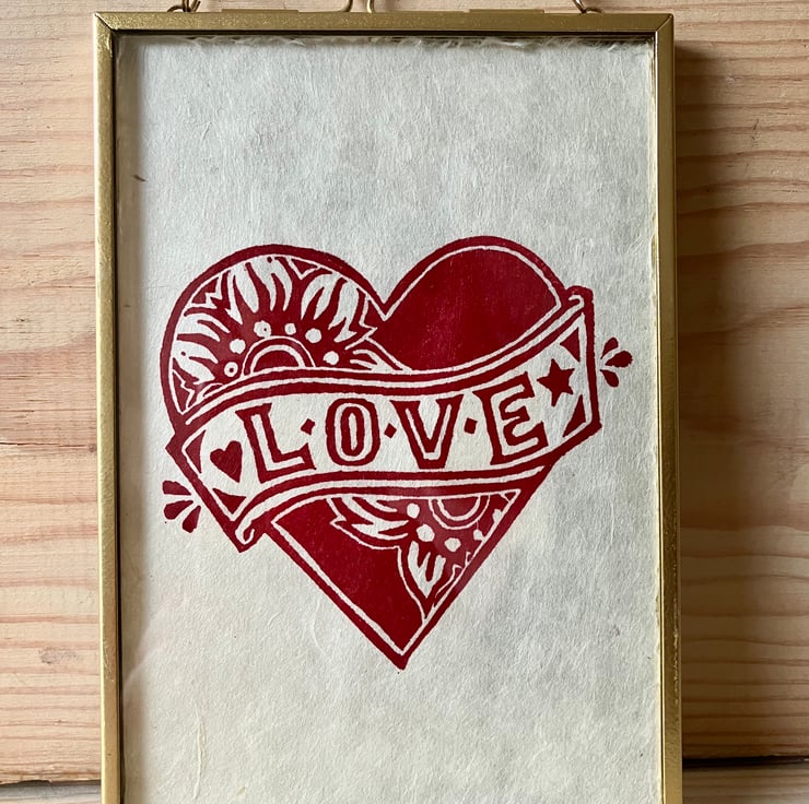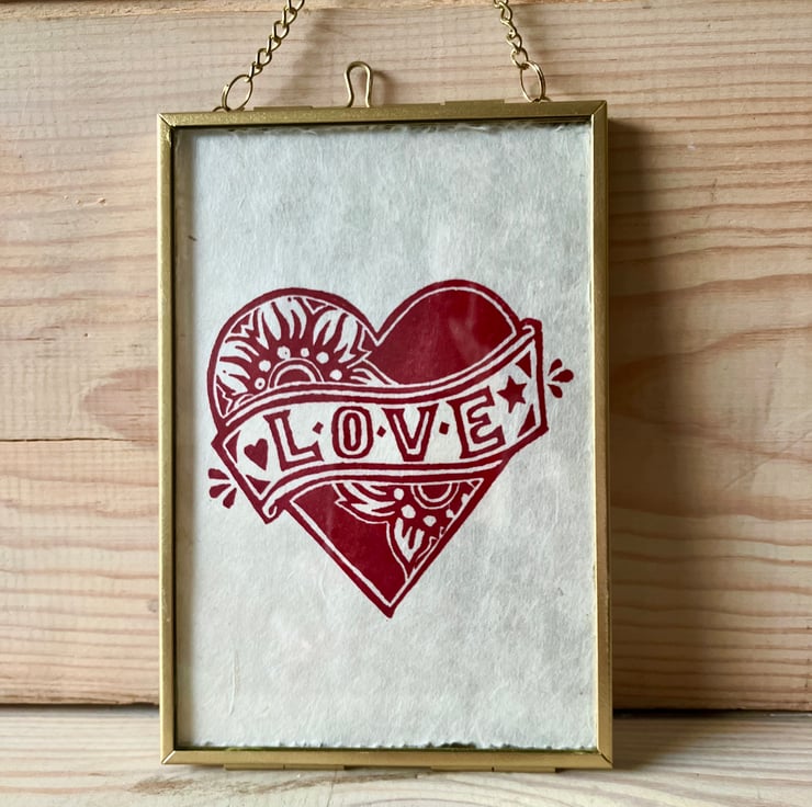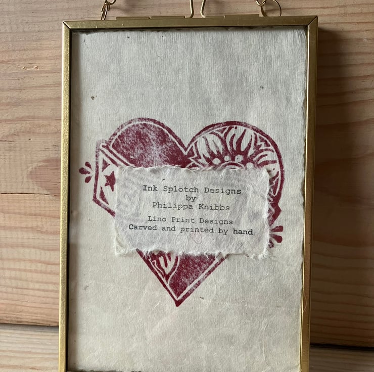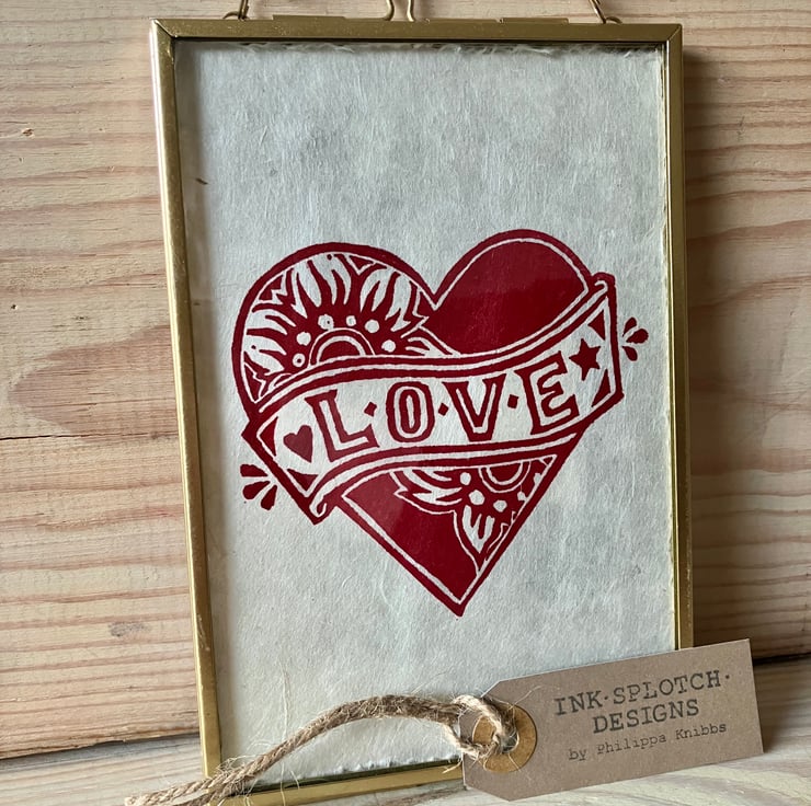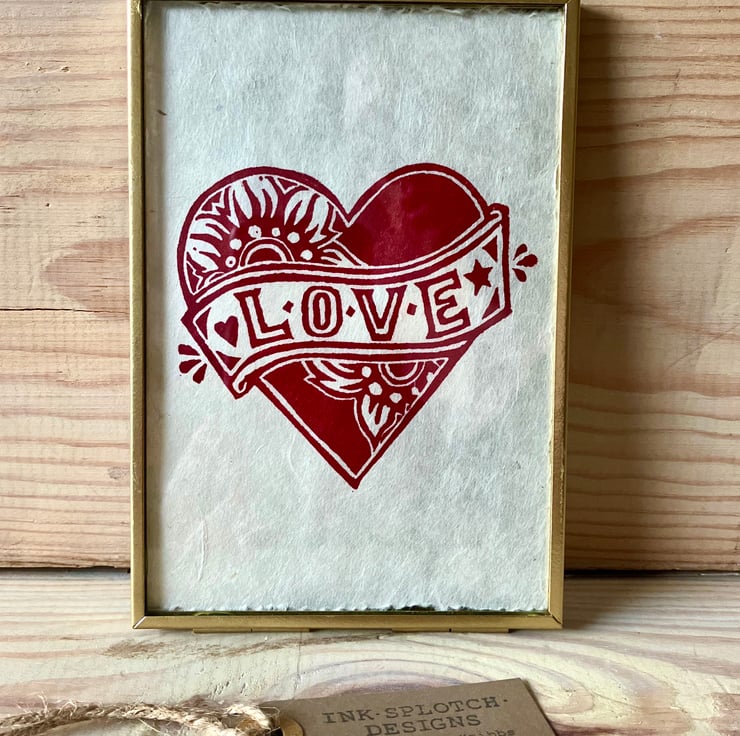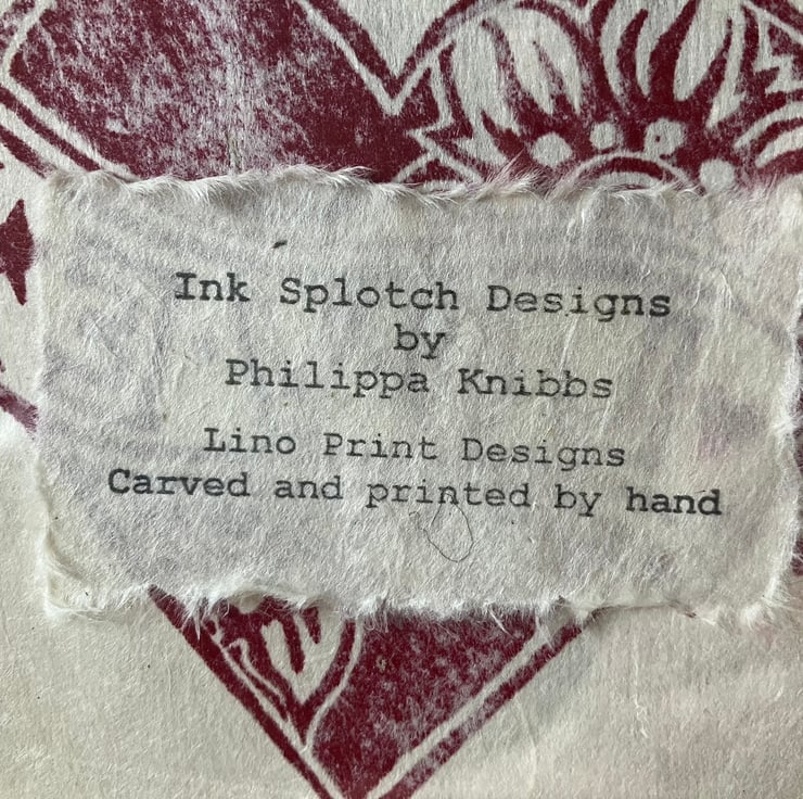 This Lino print is one of my original illustrations that has been hand carved into lino and printed onto handmade, Japanese paper using a crimson, lino printing ink. The paper contains natural flecks and fibres but this adds to the print giving it beautiful texture. It is cream/ beige in colour.