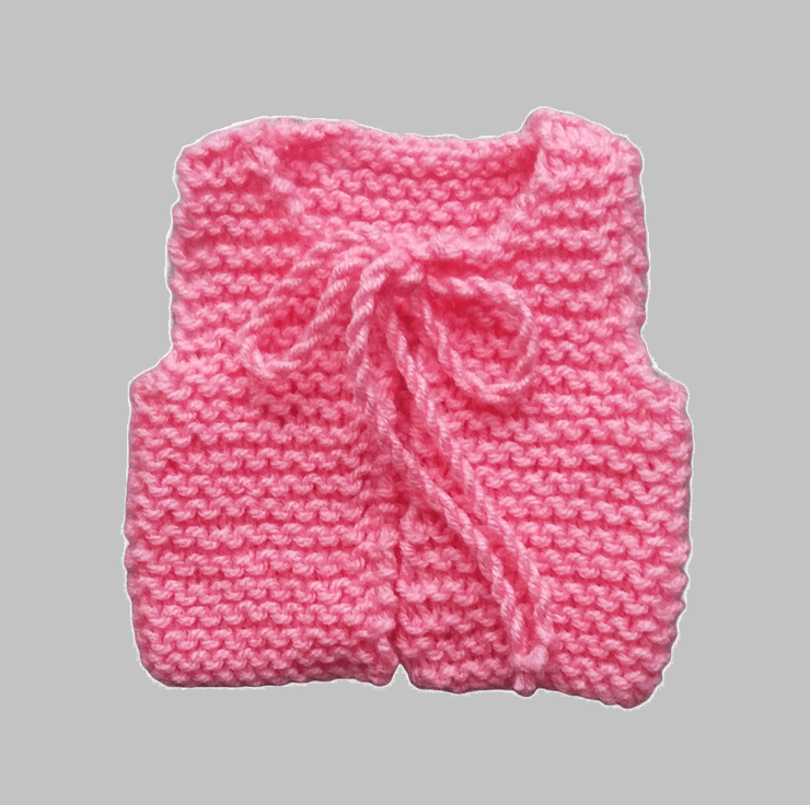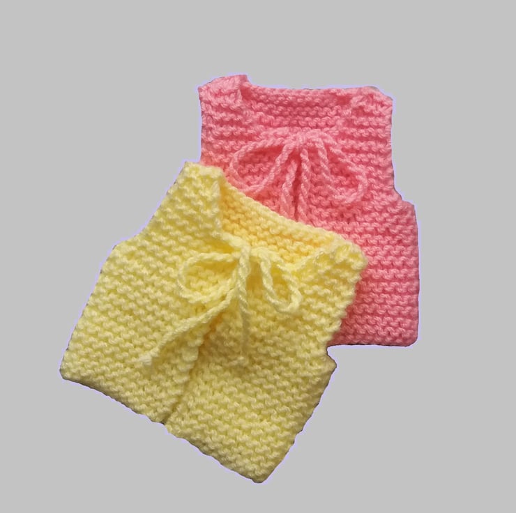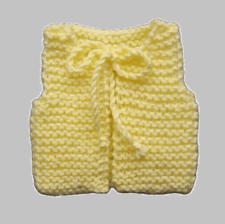 This hand knit PATTERN is for a vest for Baby. To fit: premature to newborn baby. Chest size: 26 (31: 36: 41: 46) cm or 10 (12: 14: 16: 18) inches. The vest is knitted in double knitting yarn using 4 mm knitting needles and are knit flat and seamed.