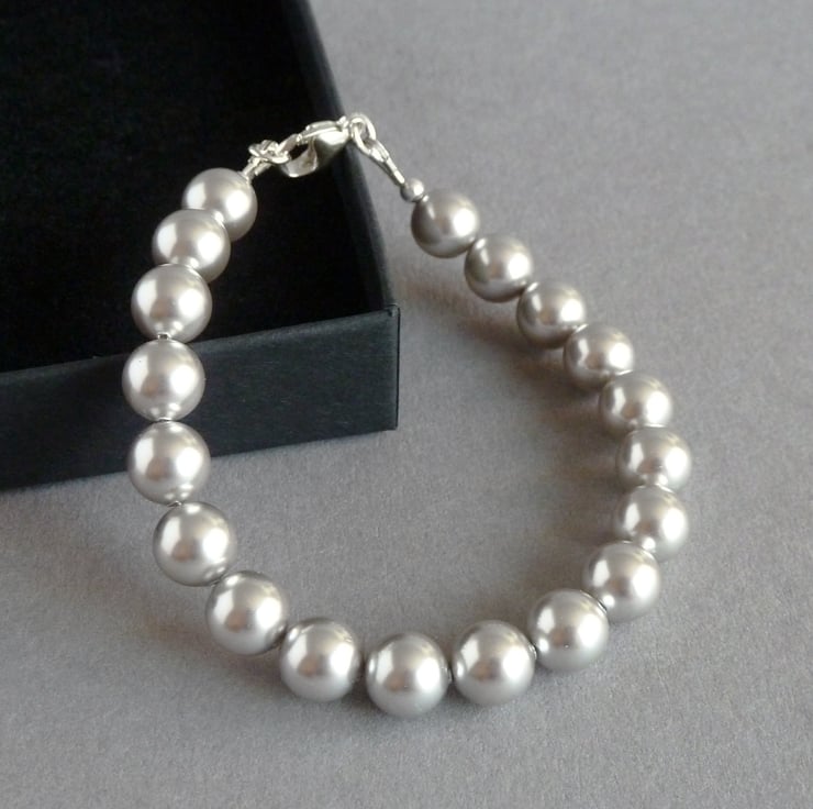 Made with 8mm silver grey pearls, these bracelets measure 19cm (7.5 inches) from end to end. Each single strand bracelet is finished with a Sterling silver lobster clasp and a 1" extension chain. With the exception of the silver plated extension chain, all metal elements are Sterling silver.