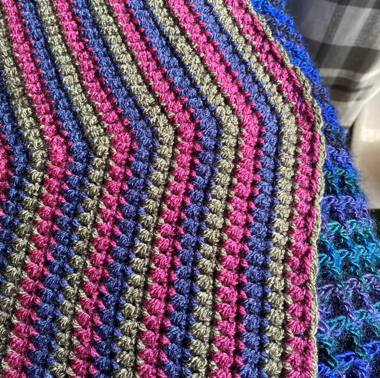 Made using Scheepjes premium 100% acrylic DK yarn (in colours Meppel, Oostende and Rotterdam), this is a lightweight and super soft blanket in a grey and berry toned colourway.