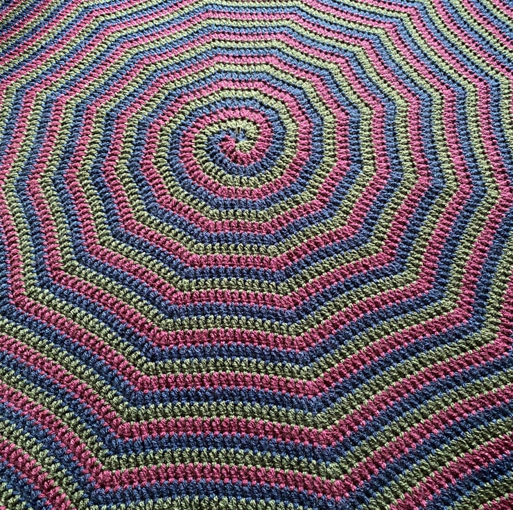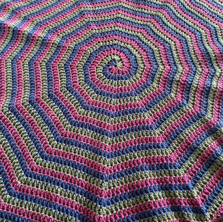 Handcrafted crochet blanket. Three colour, spiral design that fans out into a gently 12 cornered dodecagon rather than a perfect circle, giving the impression of a mesmeric cobweb. The design name is inspired by the song of the same name by The Cure, and its candy stripe legged spiderman. Hopefully cosying up under this one will leave you feeling very sleepy…
