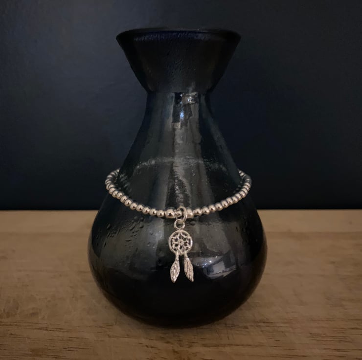 This is a hand threaded sterling silver bracelet with a sterling silver Dreamcatcher charm. This is believed to protect from nightmares and evil spirits.