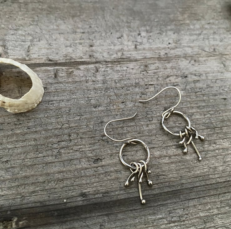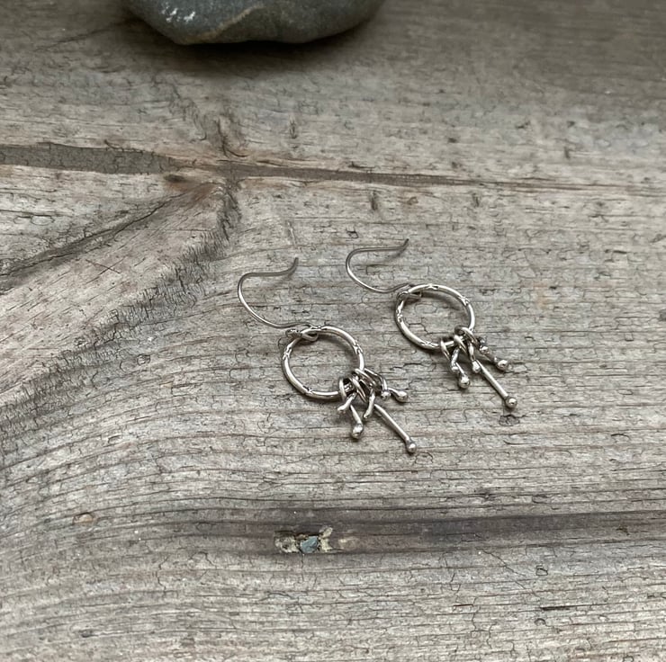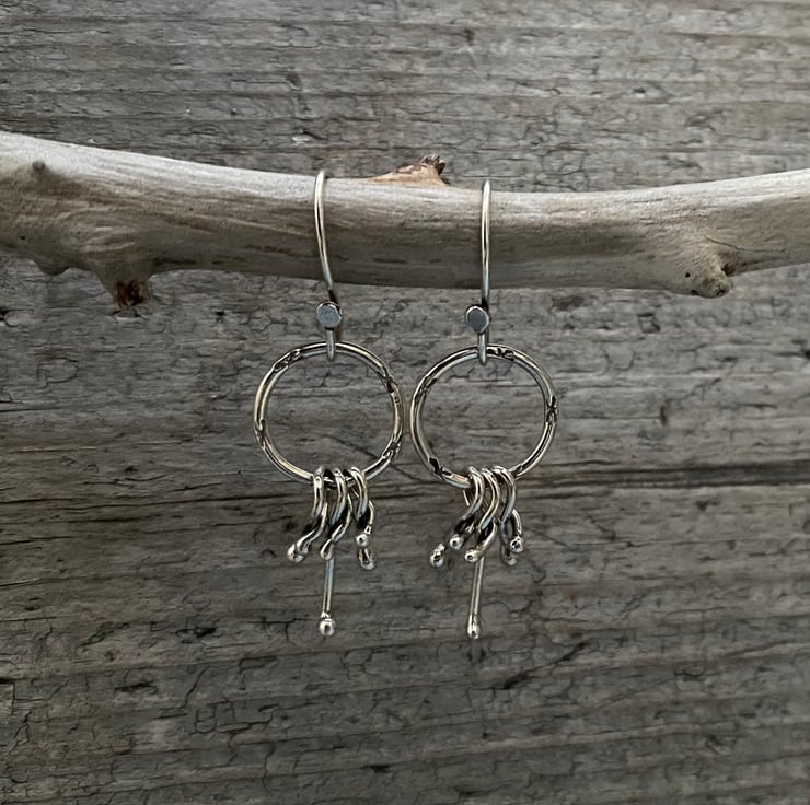 Sterling silver formed into hoops with subtle stamping to add definition. Each hoop has three sterling silver, tangled drops. They measure approximately 2.7 cm from the ear wire, and 1.5 cm across.