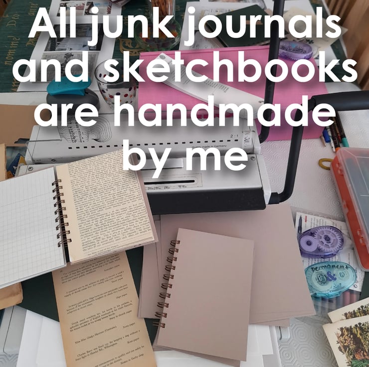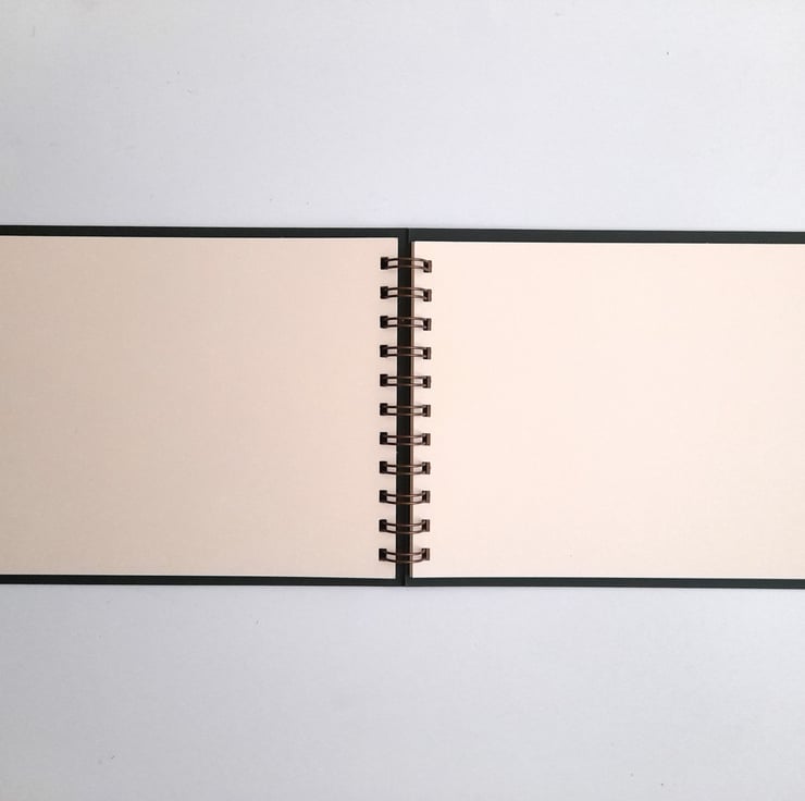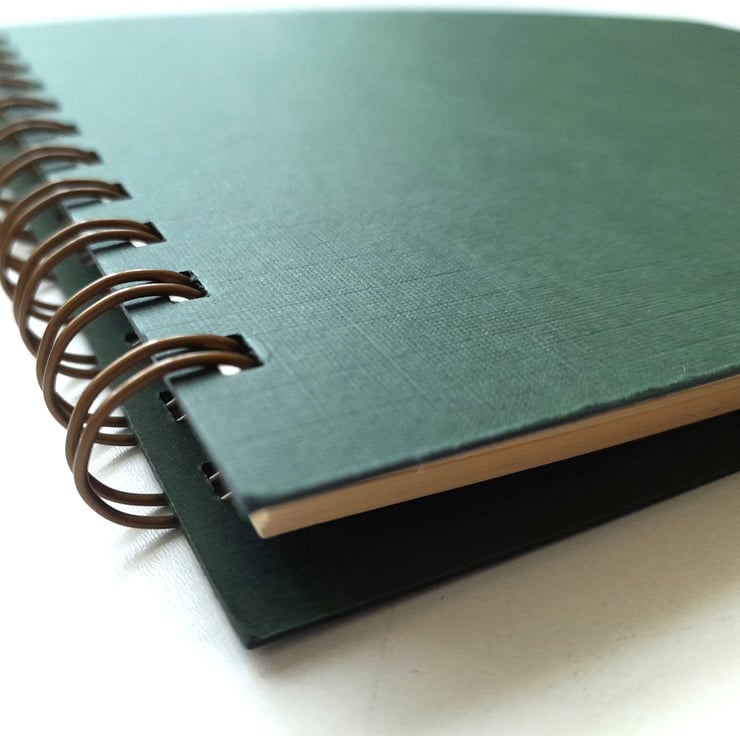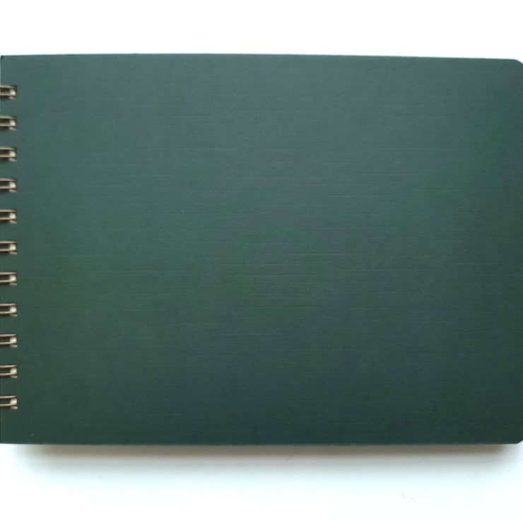 A hand made landscape blank, junk journal / notebook containing sturdy 200gsm smooth cream card pages, all neatly bound with a bronze wire and with rigid dark green textured card covers. This would be fabulous for creative junk journaling, for you to personalise and embellish. Also would be great for fine liner drawings, metallic pens, pencils and for scrapbook / memory keeping work.
