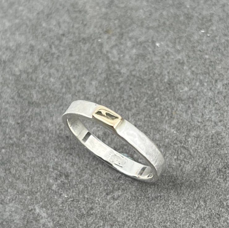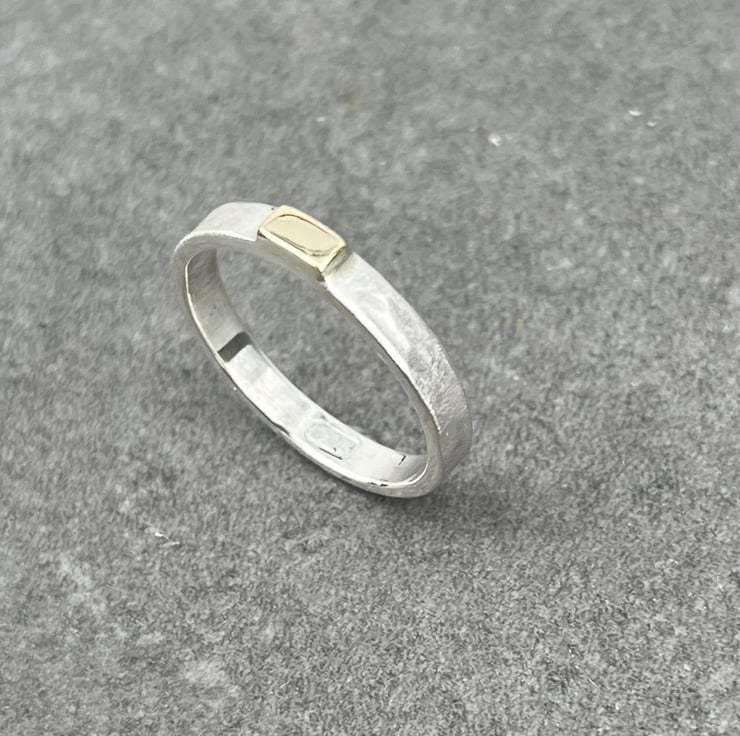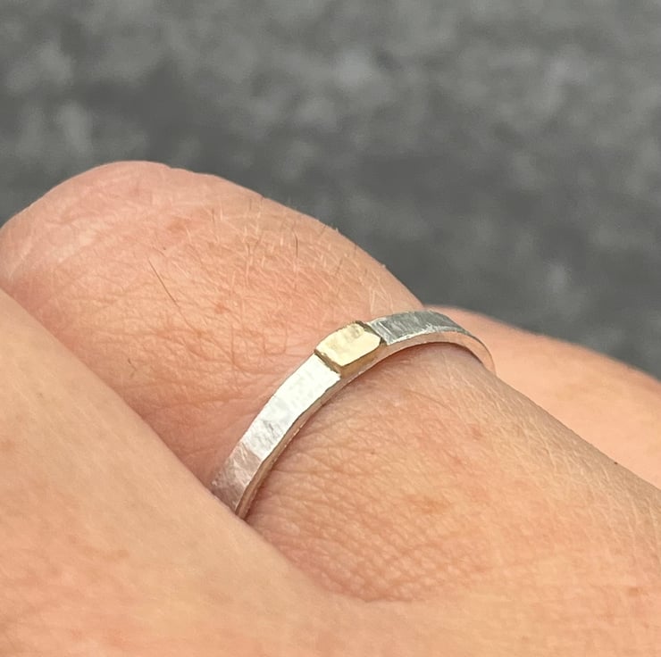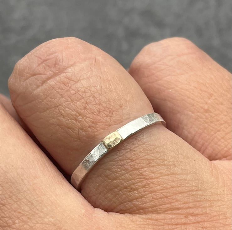 This Gold and Silver band has been handcrafted from Sterling Silver and real 9ct yellow gold. The hammered silver has been given a satin finish but if you prefer it shiny please let me know at Checkout. The width of the ring is approximately: 2.5mm wide. I can make any size so please leave the size you require at Checkout.