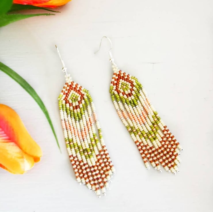 - Long beaded fringe earrings featuring a tribal style, sunrise design