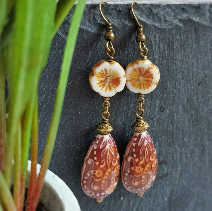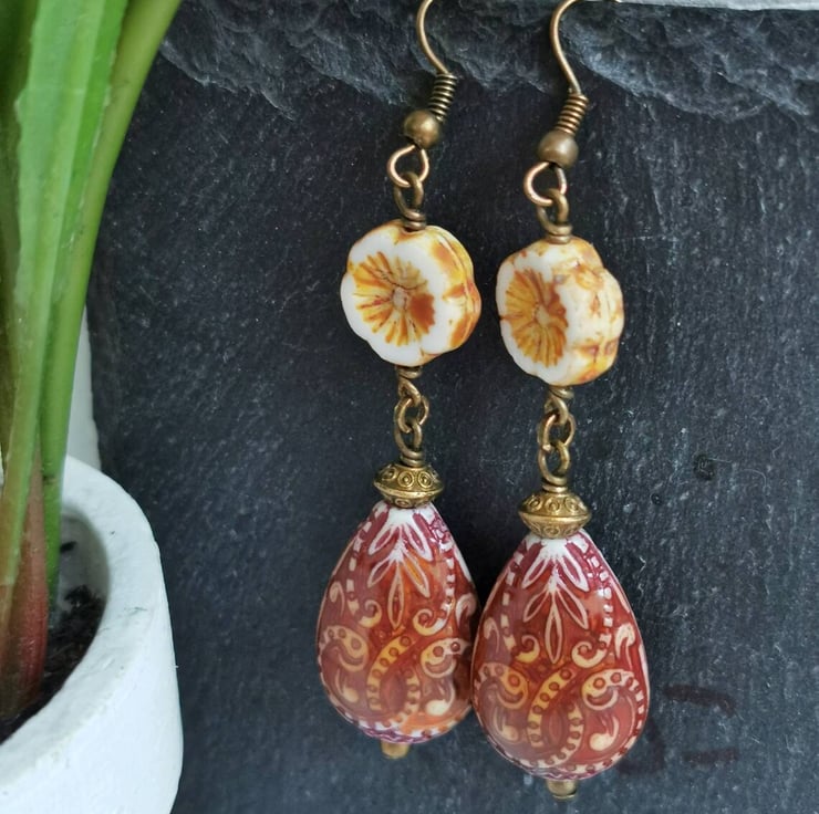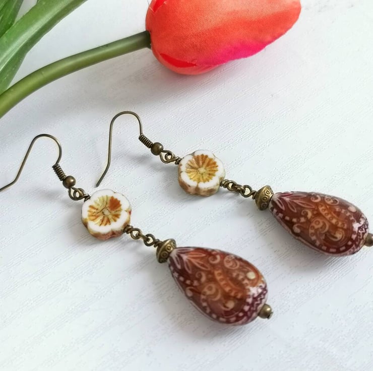 - Pretty antique bronze long boho earrings featuring ceramic, mood predicting Mirage Beads.