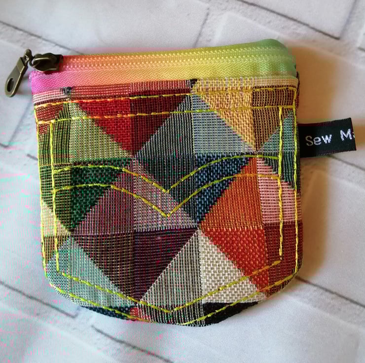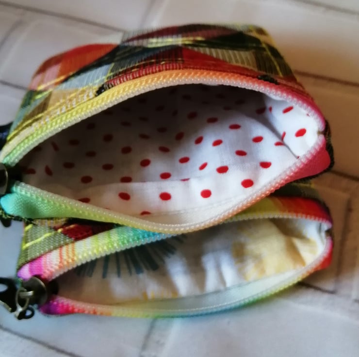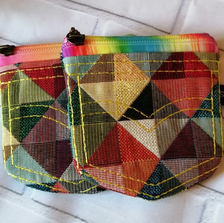 A very cute and colourful purse made in a jeans pocket design. The purse is made in a lovely colourful check, it's fully lined and has a rainbow coloured zip, which compliments the fabric. It really looks cute and it's a perfect size to fit into a small handbag. Price quoted is for one purse only. There are two available.