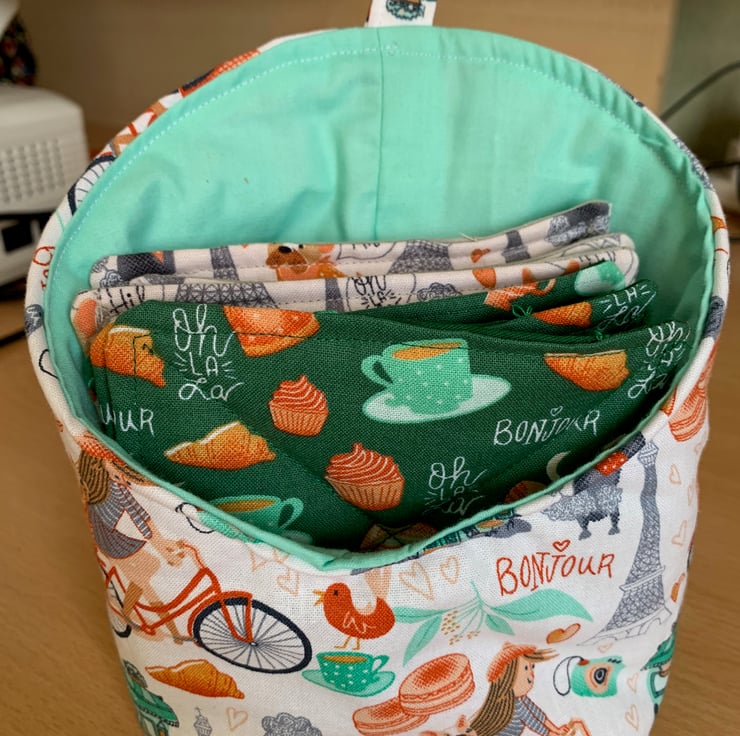 Six quilted coasters - three green and three grey; one coffee 'zarf' for around your takeaway coffee cup, and a mini 'bin' or storage pot to keep it all in, or use for something else. There is only one set available, totally unique!