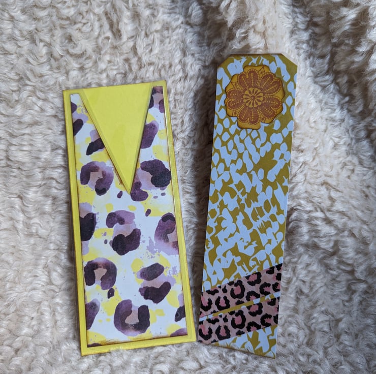 Mini journal - two magazines of mixed white, purple spotted and yellow grid paper, an animal print button on the front attached to gold thread fastening and a purple wooden peg on the spine with open binding. Front and back inside covers each has a pocket with a pull out journal card