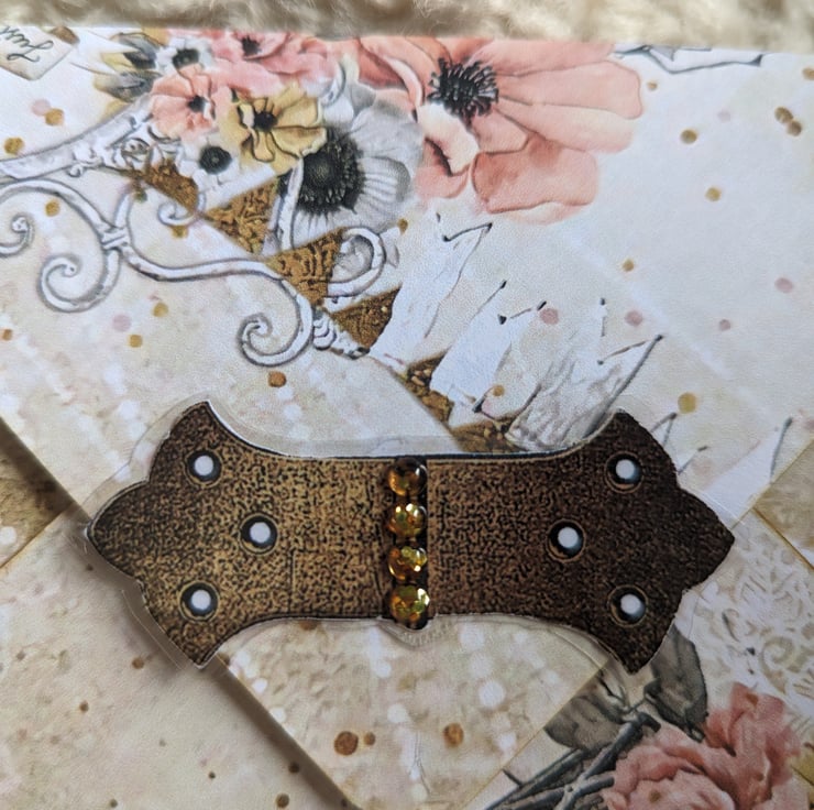 The front of the envelope there's a laminated buckle complete with 4 gems down the middle.
