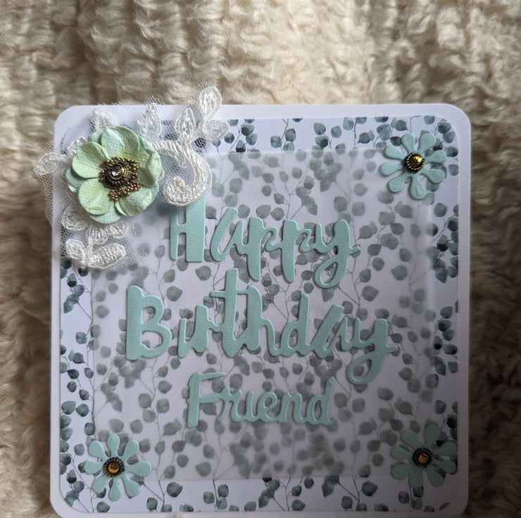 Square white card stock overlaid with a green leafy patterned paper with light green 'Happy Birthday Friend', underneath a vellum sheet