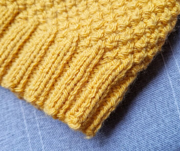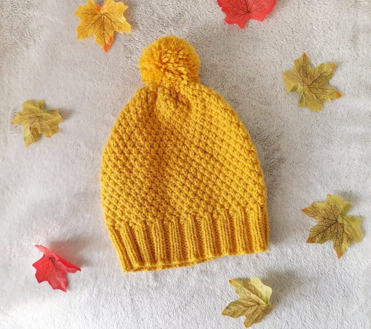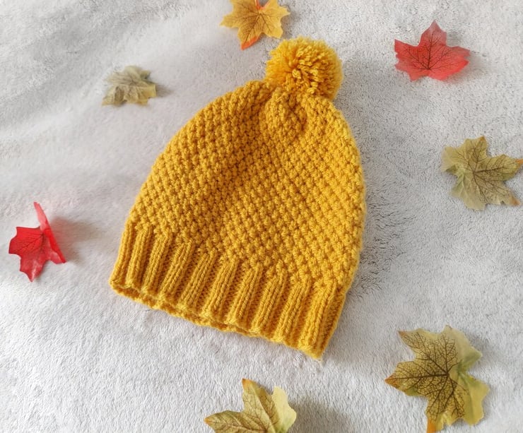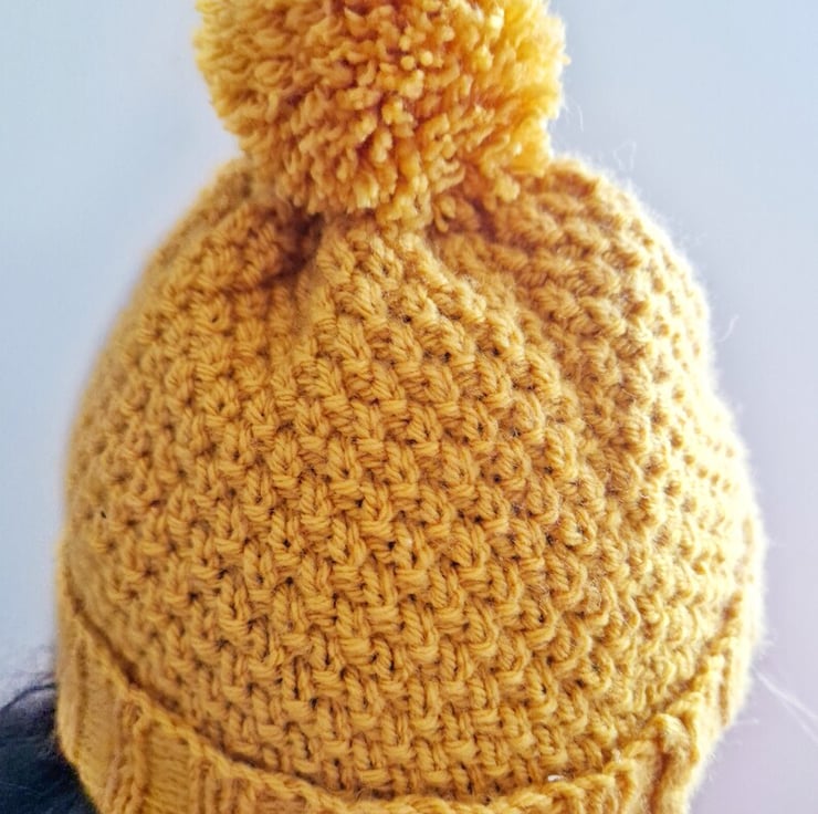 Crafted from a quality, and vegan friendly, Ochre Yellow acrylic yarn, this chic hand knit pom pom beanie features a beautiful squishy moss stitch which adds to its cosiness. The brim of this aran knit beanie has been completed in a 2x2 rib, allowing for a flexible and comfortable fit.