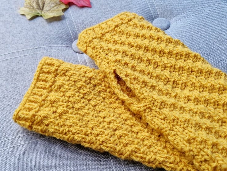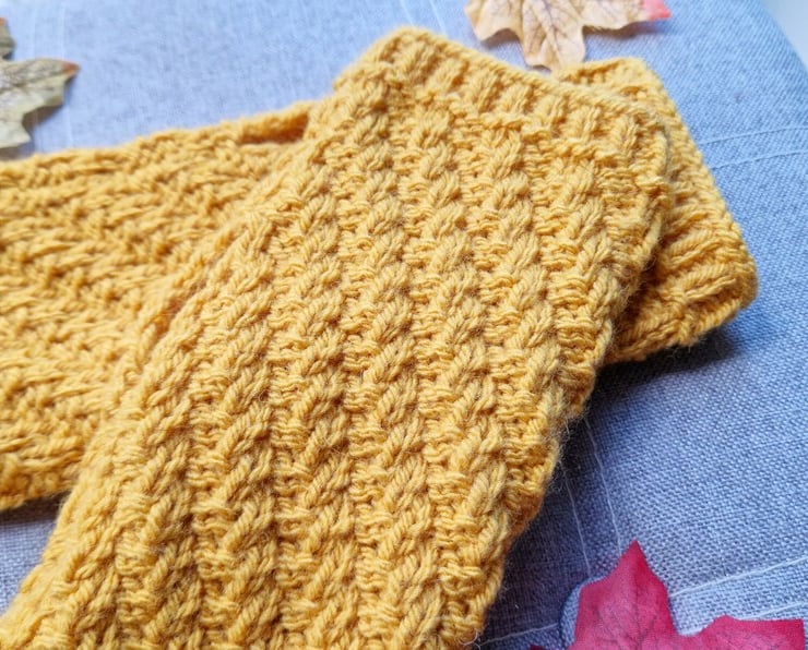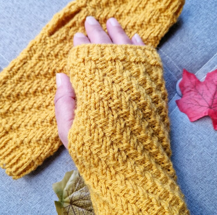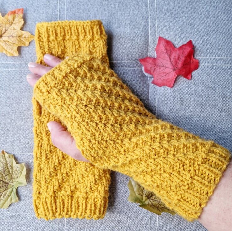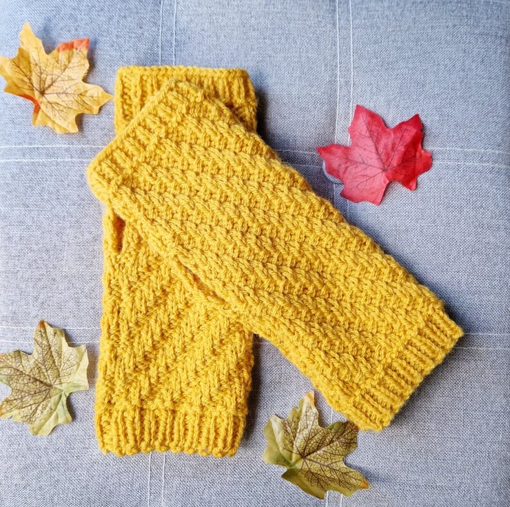 - Eye-catching mustard yellow wrist warmers featuring diagonal rib pattern