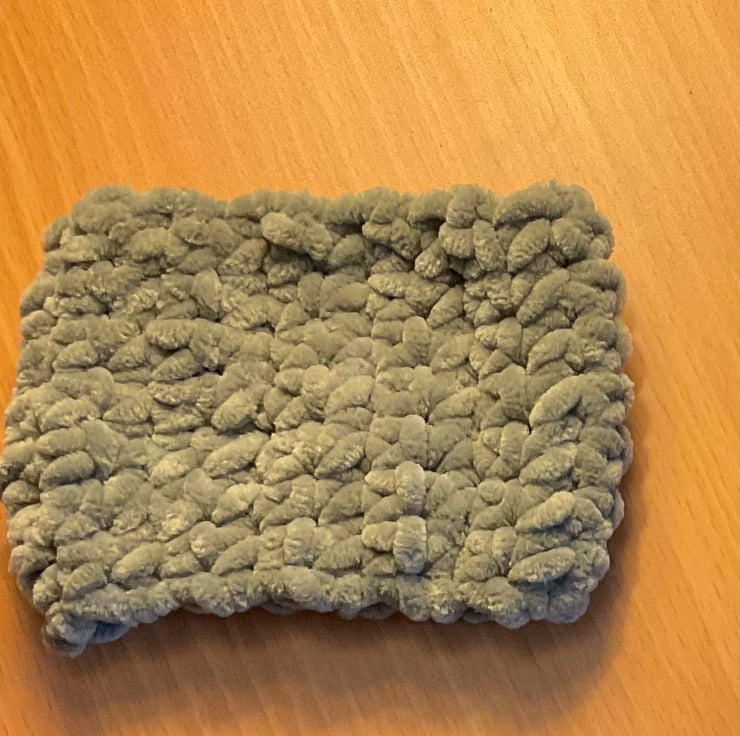 Crochet Cup Cosy in sage green/grey soft chunky yarn.