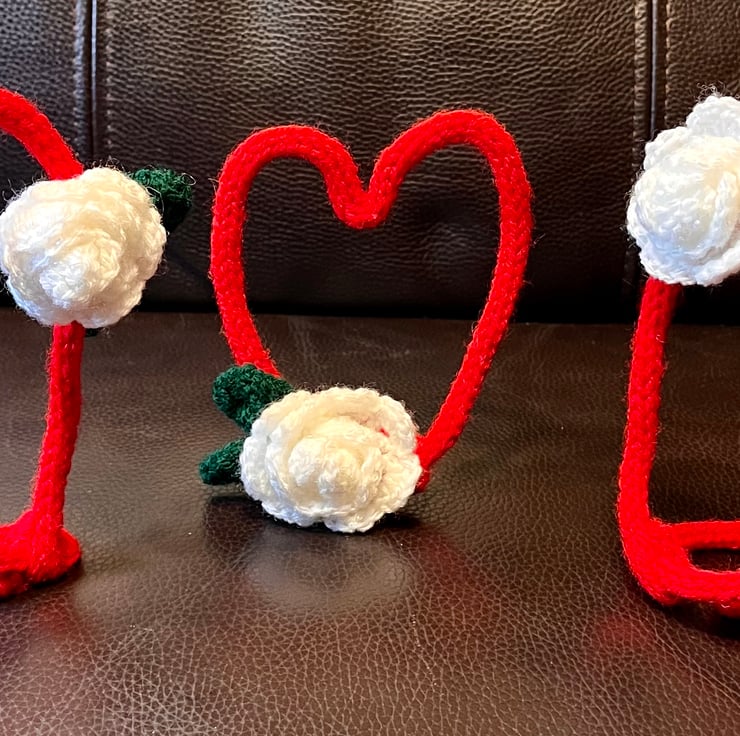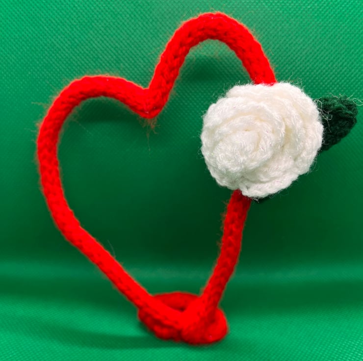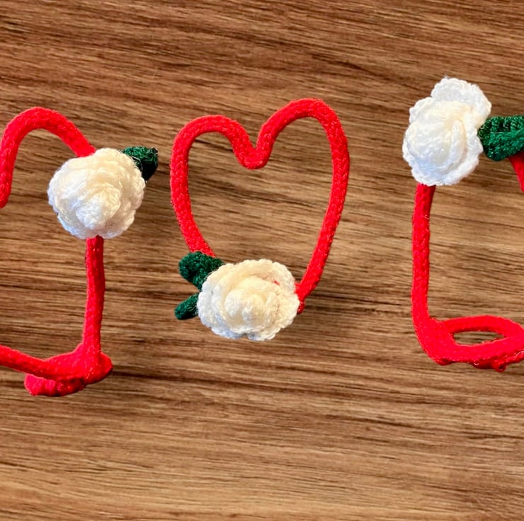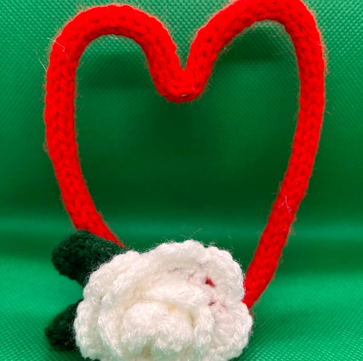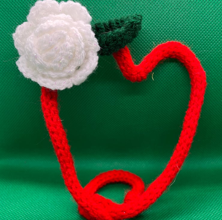 The hearts are made of stainless steel bendable wire with French knit covers in red acrylic yarn. Each has a white crochet rose and green leaf to accent the hearts.