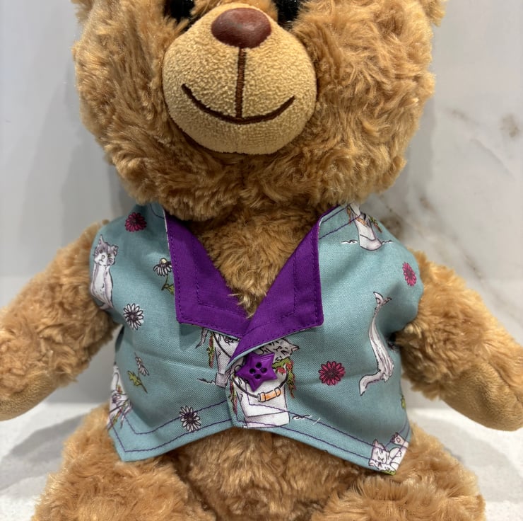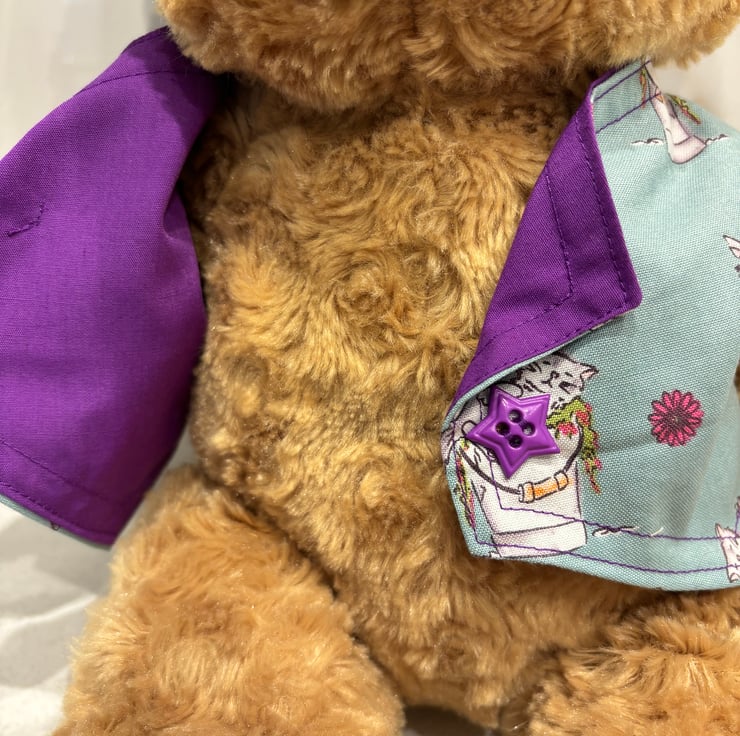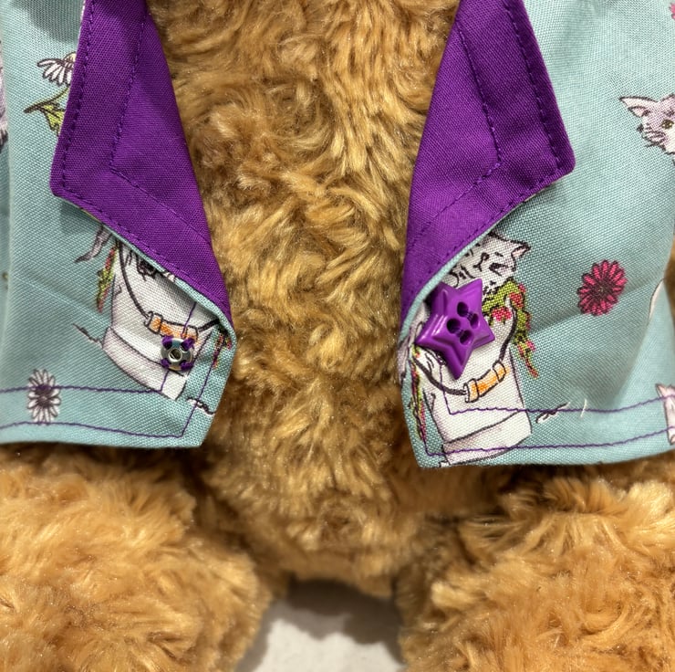 Waistcoat to fit a large size teddy bear, approx size 19”/48cm tall. This size fits The Build a Bear teddies. The colour is hard to describe its like a slate green. The photos are a true guide. The waistcoat is lined in a rich purple. This compliments the waistcoat colour beautifully.