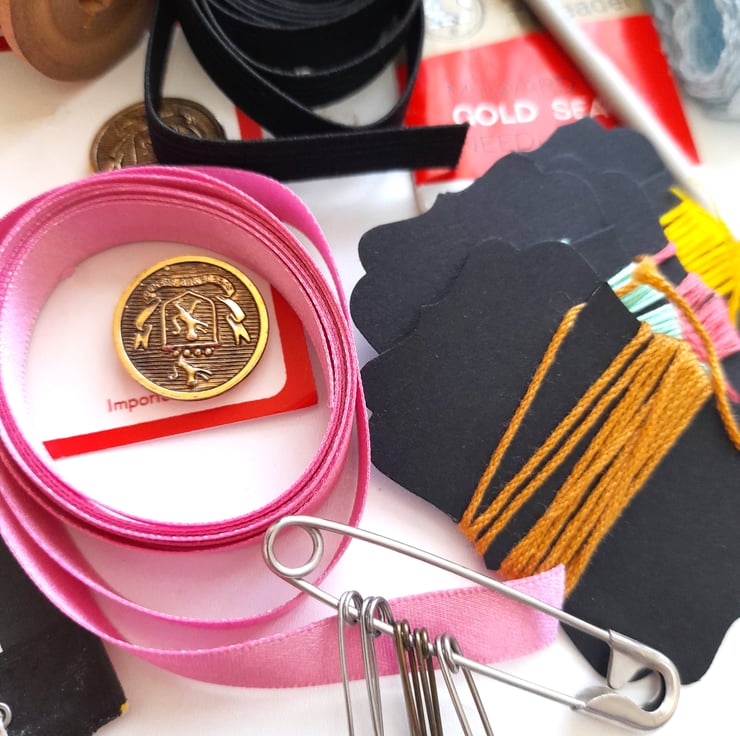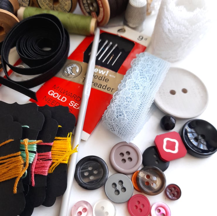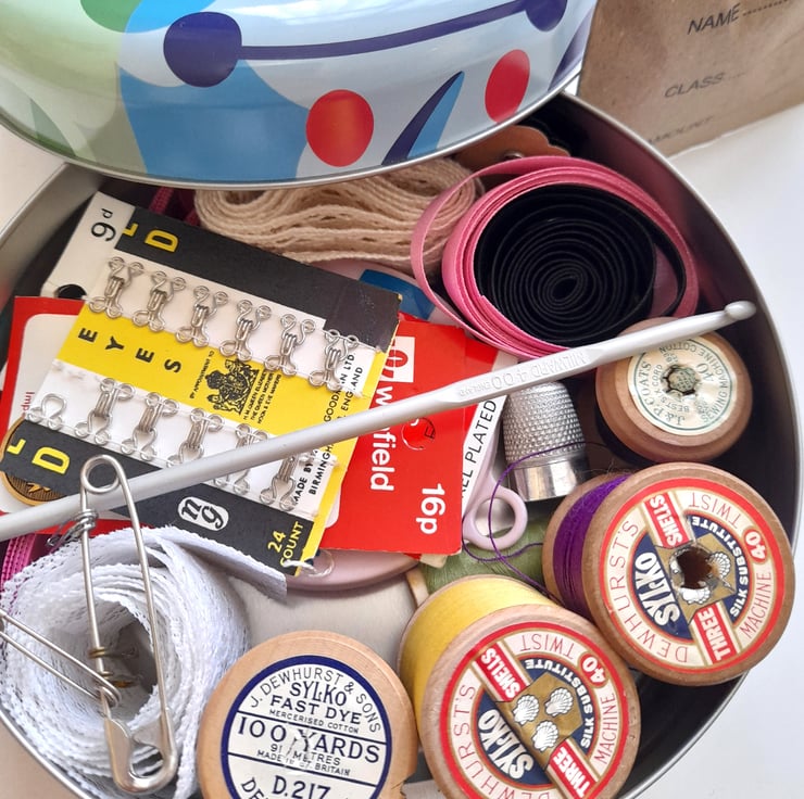 This lovely sewing kit includes all the essentials to make your sewing projects a dream. Although it is curated mainly with vintage pieces, all are perfectly functional. From needles and thread to pins and ribbons - it's a lovely collection, all neatly contained within a colourful tin (which is a couple of years old). Great for adding to your sewing supplies or as a needlework starter kit.