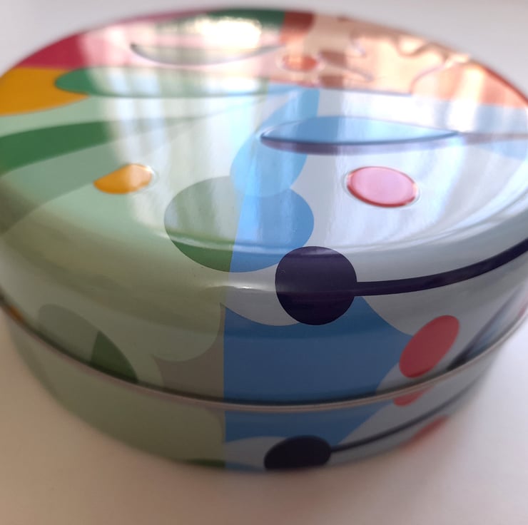 Round tin, brightly coloured (approx. 14.5cm in diameter, 5cm deep)