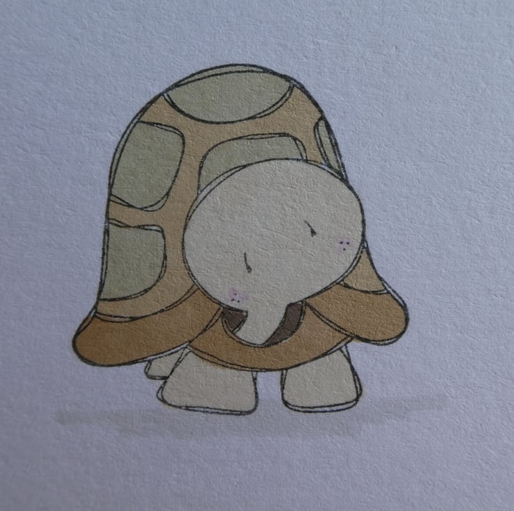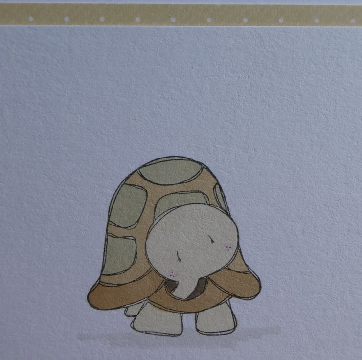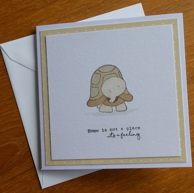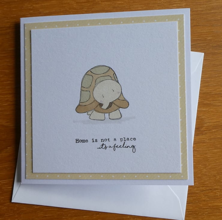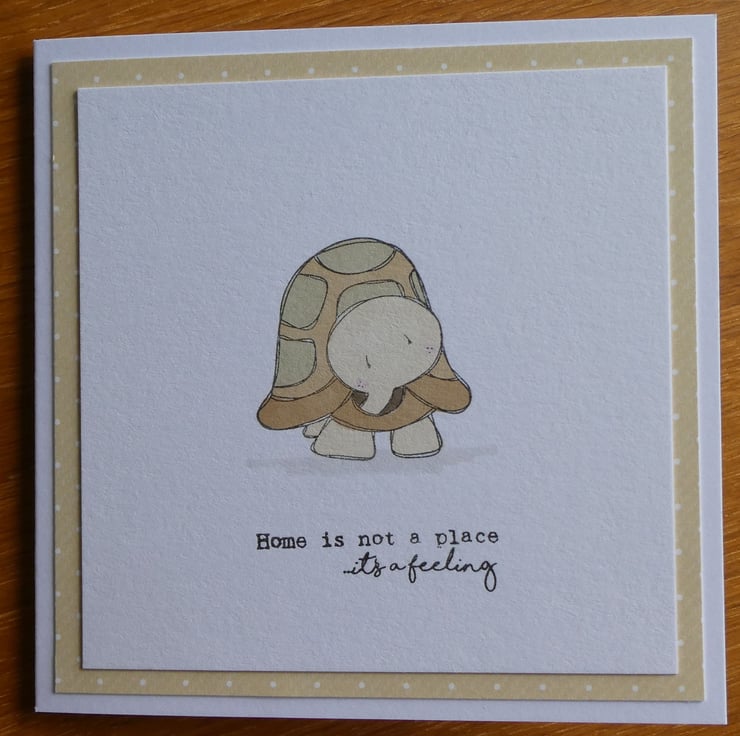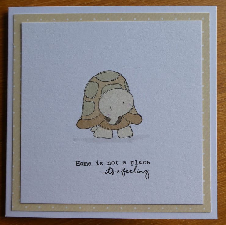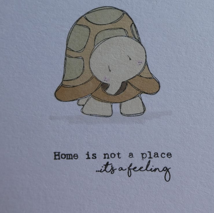 This sweet New Home card has been hand stamped with a cute tortoise. It has been hand coloured in pastel shades of brown and beige and finished with the greeting 'Home is not a place it's a feeling' in a mixture of fonts.