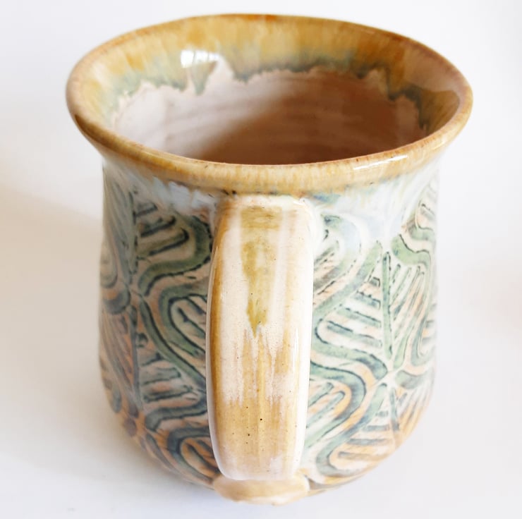 Glazed in grey and beige glazes with a pattern on the mug.