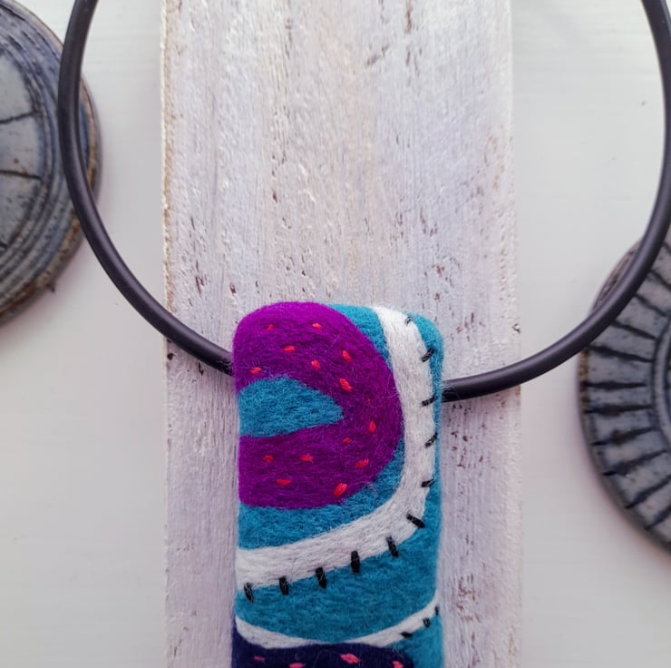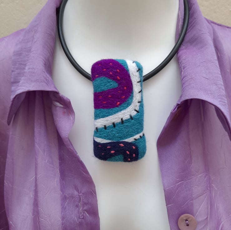 Made by Needle felting with a variety of needles over several hours with a few stitches and hand stitching on the back using manufactured felt backing.