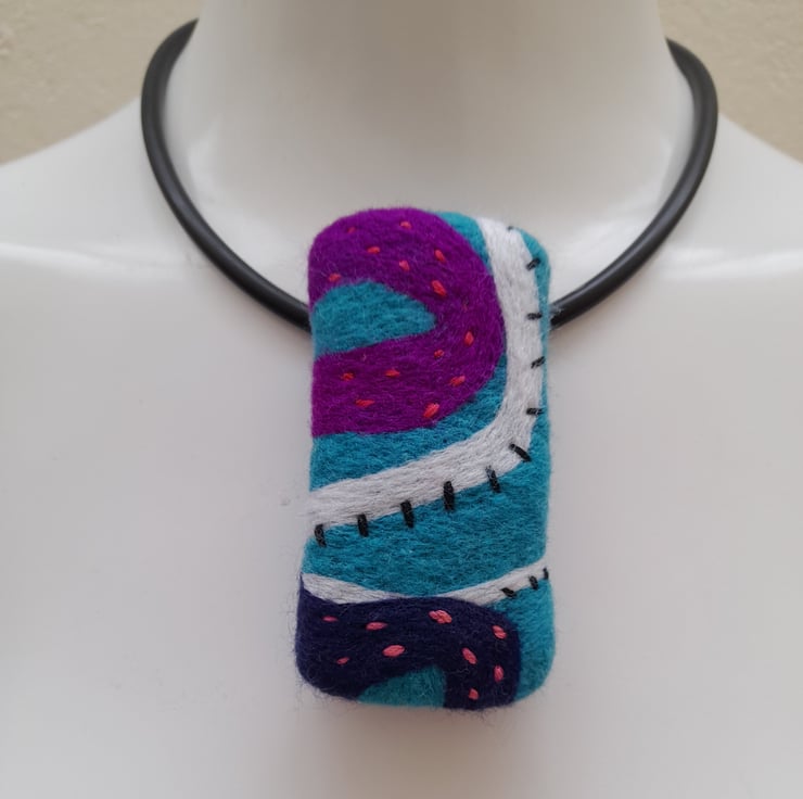 The rubber necklace cord has a silver 925 push and twist clasp it is 17 1/2 inch With the textile piece attached it is about 15.5 inch and the textile piece is about 2 inch across at that point.