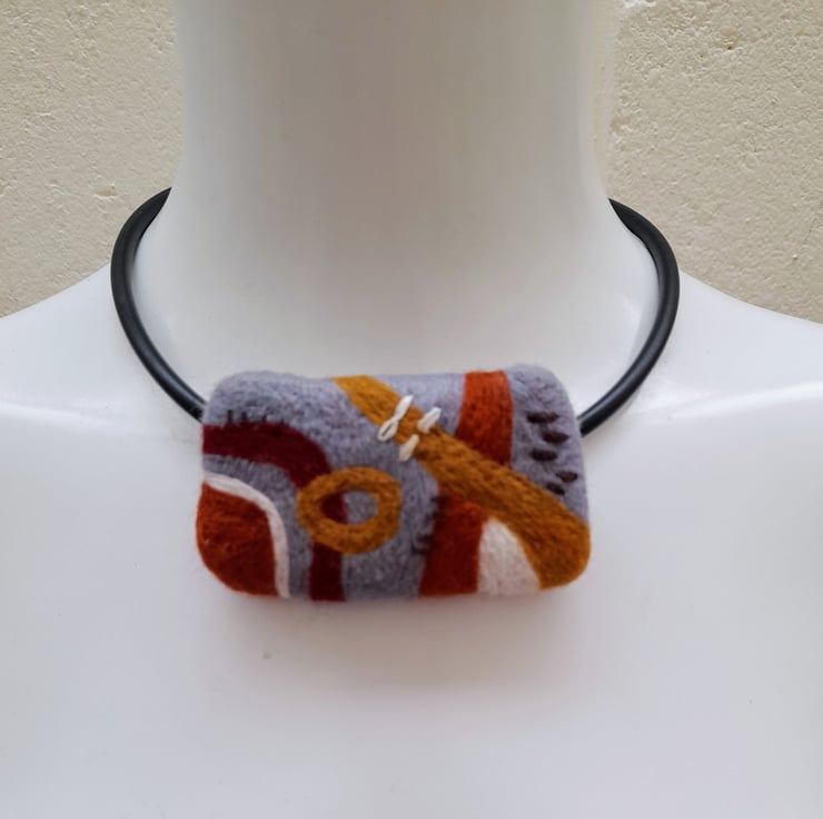 The rubber necklace cord has a silver 925 push and twist clasp it is 17 1/2 inch With the textile piece attached it is about 14.inch and the textile piece is about 3.5 inch across at that point.