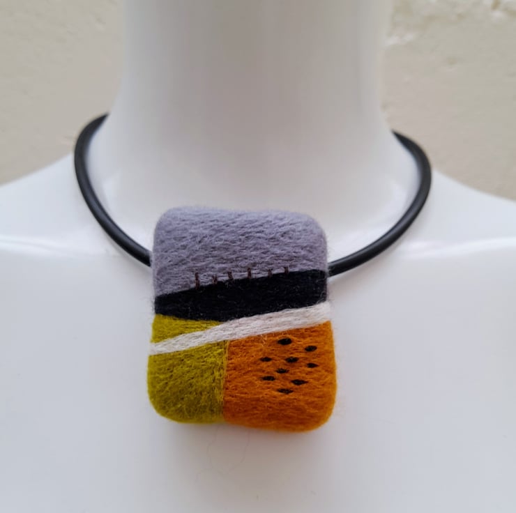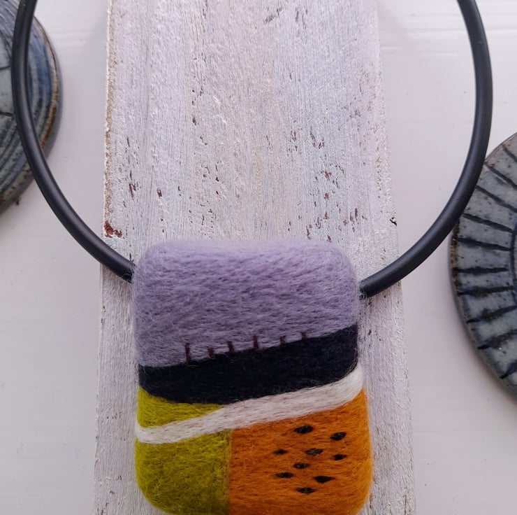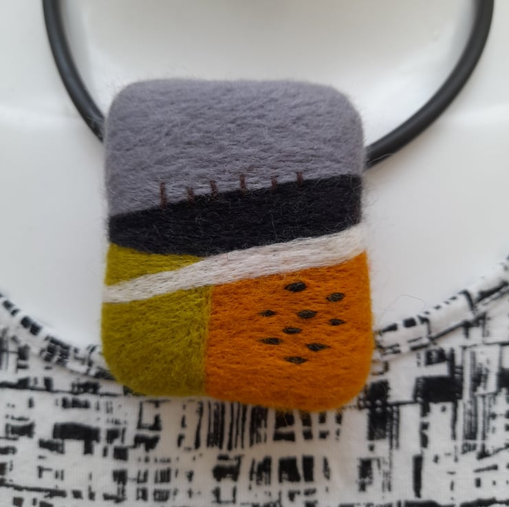 Made by Needle felting with a variety of needles over several hours with a few stitches and hand stitching on the back using manufactured felt backing.