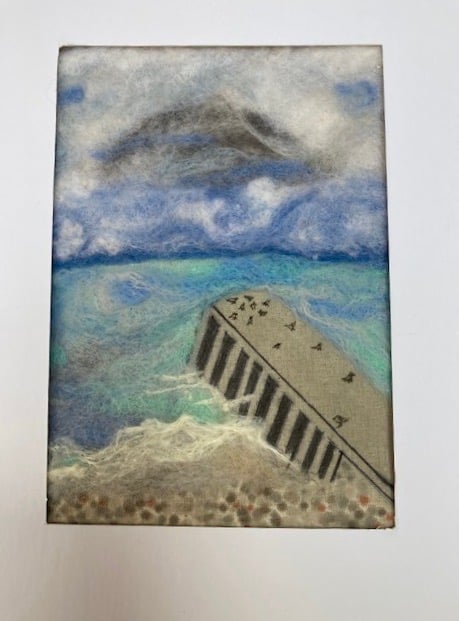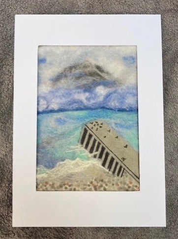 This piece of art depicts the birds gathering on the jetty on a bright, windy Autumn day. It has been made using the needle felting process with merino wool and art pens. The picture has been surrounded with white mounting board and is backed with white calico material, ready to frame. The inner part of the picture measures 20.2 cm x 14.2 cm and the whole picture measures 29.6 cm x 21 cm.
