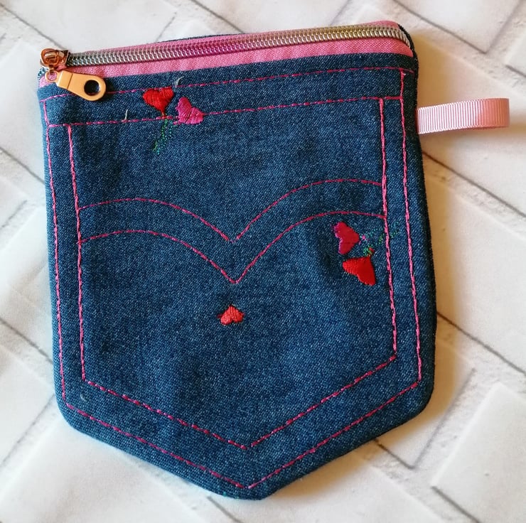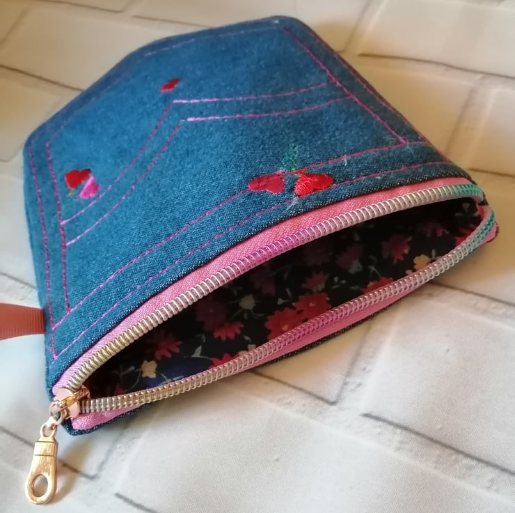 Another cute make up bag made by me. I made this bag in a lovely embroidered heart denim fabric. it is fully lined with a blue and pink cotton lining and closes with a cute rainbow zip.