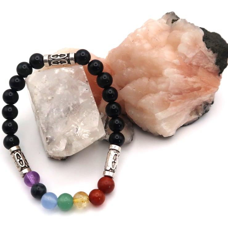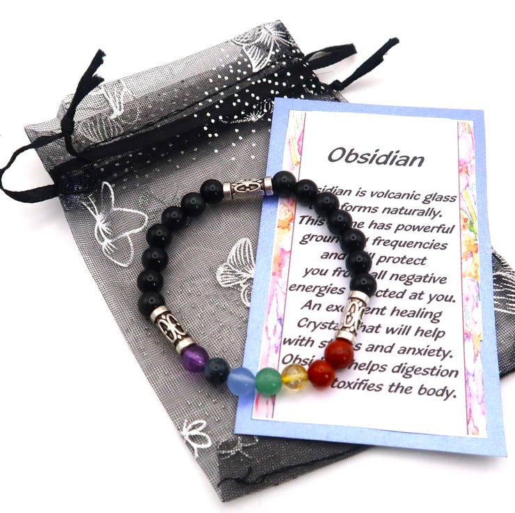 For this Pretty Bracelet I have used 6mm Genuine Obsidian Beads and 6mm Beads that relate to the 7 Chakras. I have added 12x4mm Tibetan Silver Spacer Beads.