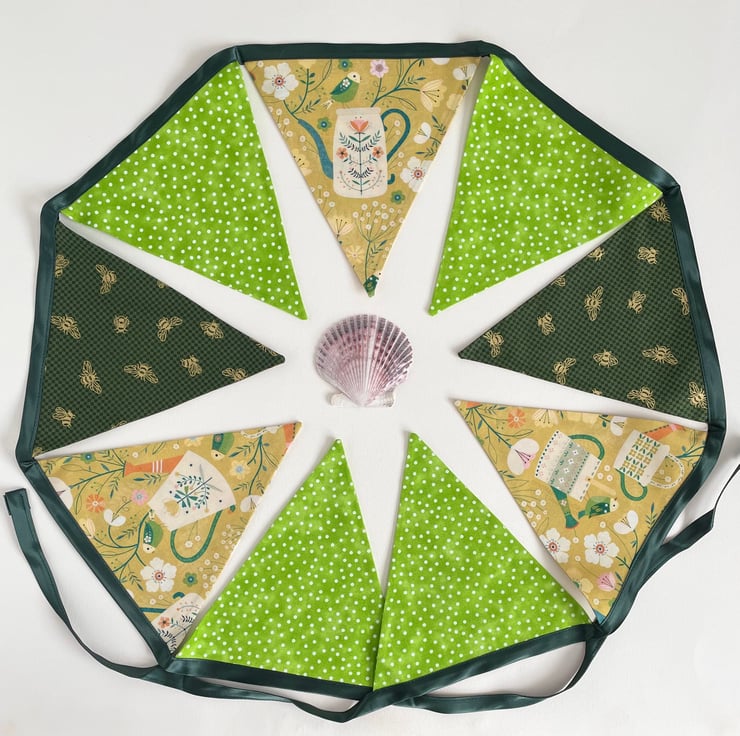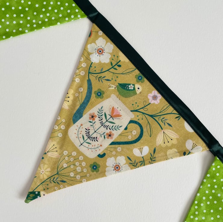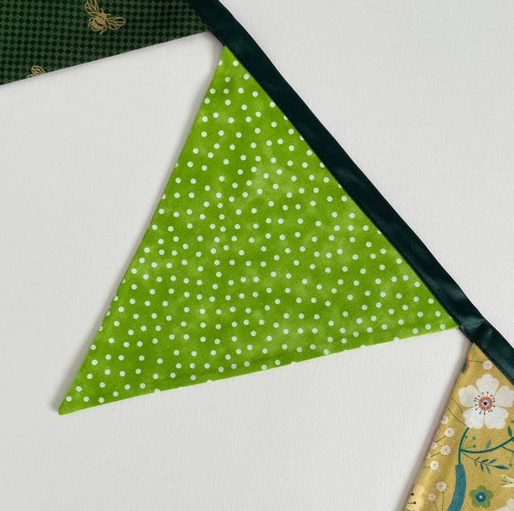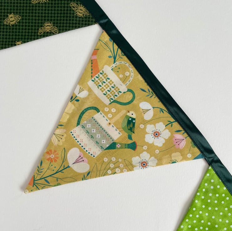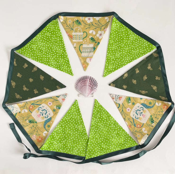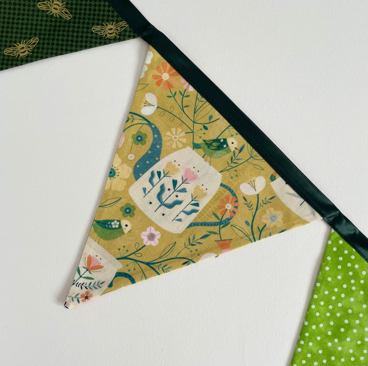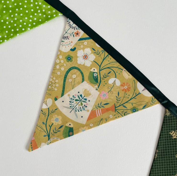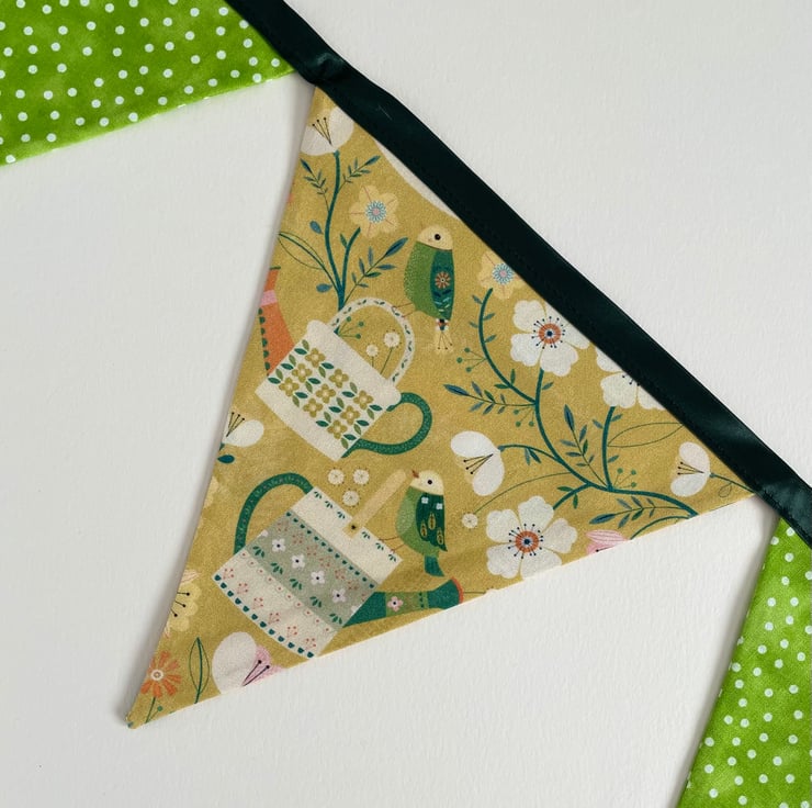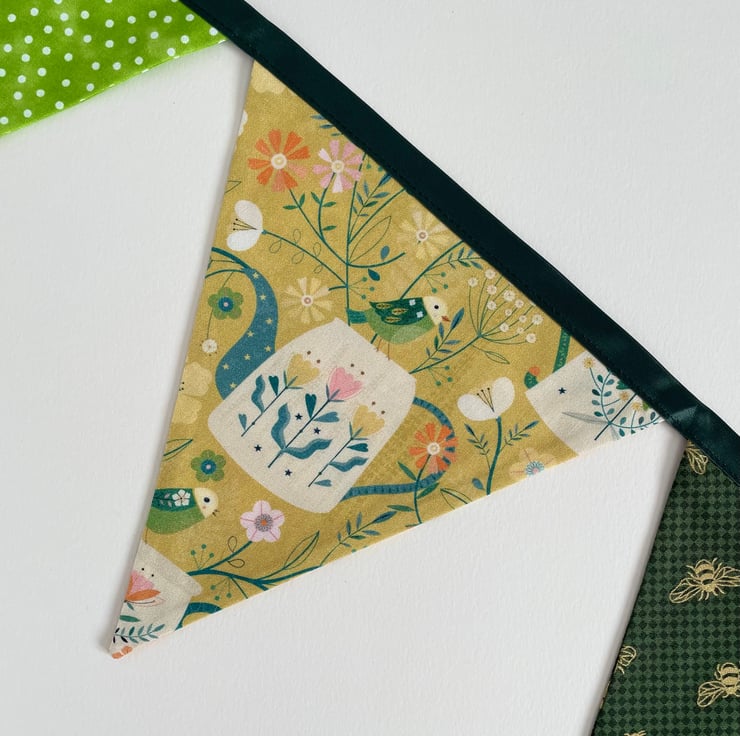 Beautiful bunting with a cute bird fabric. 9 double sided panels. 249 cm long from one side to another.